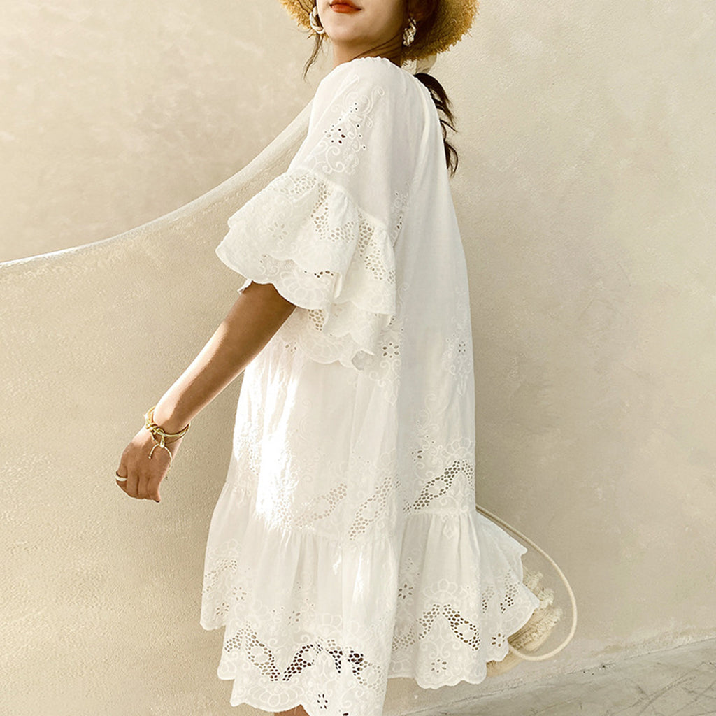 فستان بيضاء الفستان مع قواطع lacy وأكمام قصيرة