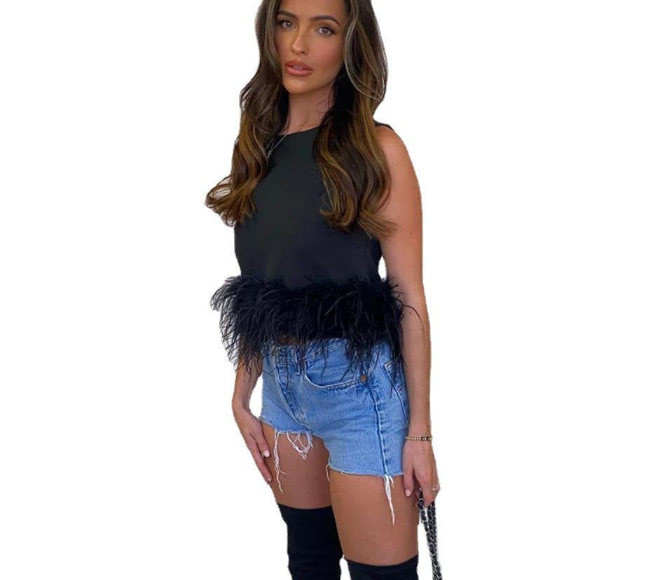 الجزء العلوي من دبابة الرقبة بلا أكمام مع خصص الريش