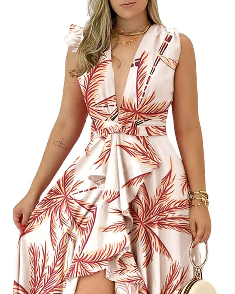 أضف بعض المشاعر الاستوائية إلى مظهرك الصيفي من خلال ارتداء فستان نمط نباتي كبير للسيدات يتميز بتفاصيل التصميم الورقية وتصبح منخفضة. لديها طول ماكسي مع تنحنح منخفض منخفض.