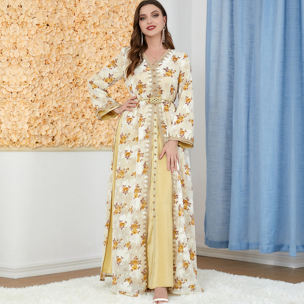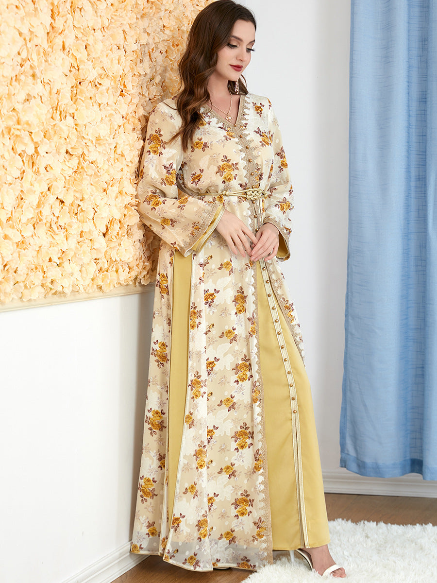Perfect for fall, the Women's White and Gold Long Sleeve Maxi Dress features warm autumnal colors of gold, crimson and cream for an elegant combination.