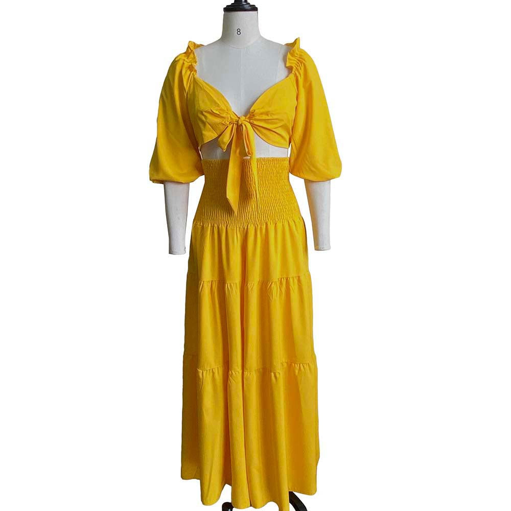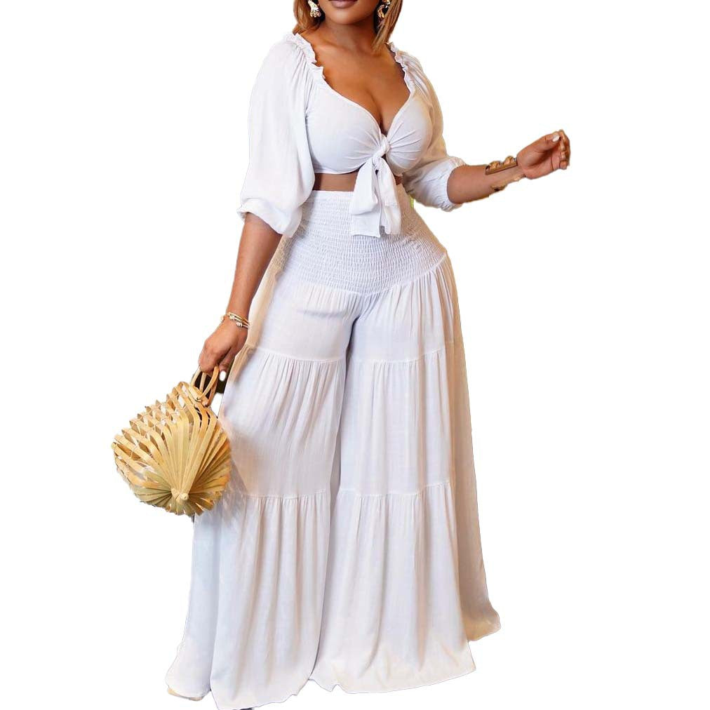 Catch the eye of anyone you pass wearing this Women's Two Piece Cropped Top and Loose fitting Pants Set that offers an alluring peek at your midriff and features a low cut V-neck with three quarter length sleeves.