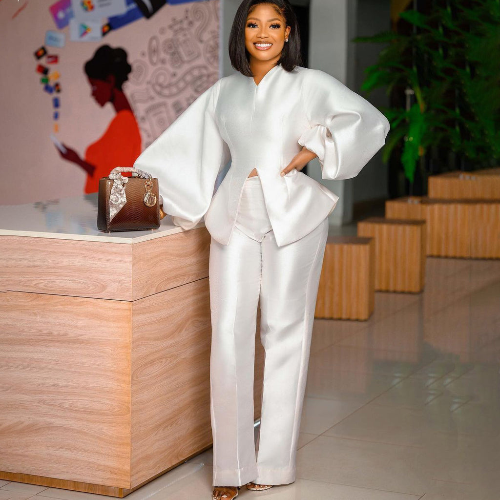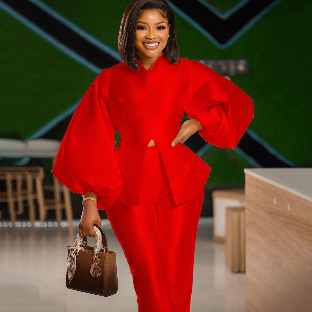 You will be the epitome of class and sophistication wearing this women’s pant suit. This gorgeous two-piece features a peplum-style top with an elegant mock neck and exaggerated balloon sleeves that instantly make a statement, while the center split detail at the front adds an element of interest. The matching pants have a high-rise waist to flatter your feminine figure, finished with seams to give a tailored fit. The fabric has a luxurious sheen that makes this two-piece pant suit ideal for business and formal occasions. Pair yours with pin-thin high heels and minimal jewelry pieces for an ideal look.