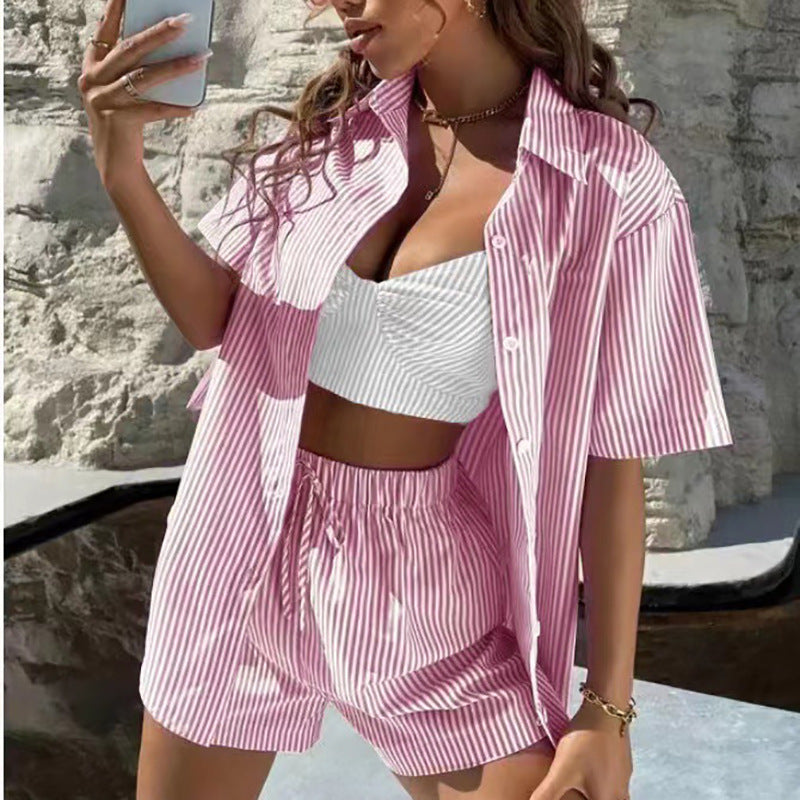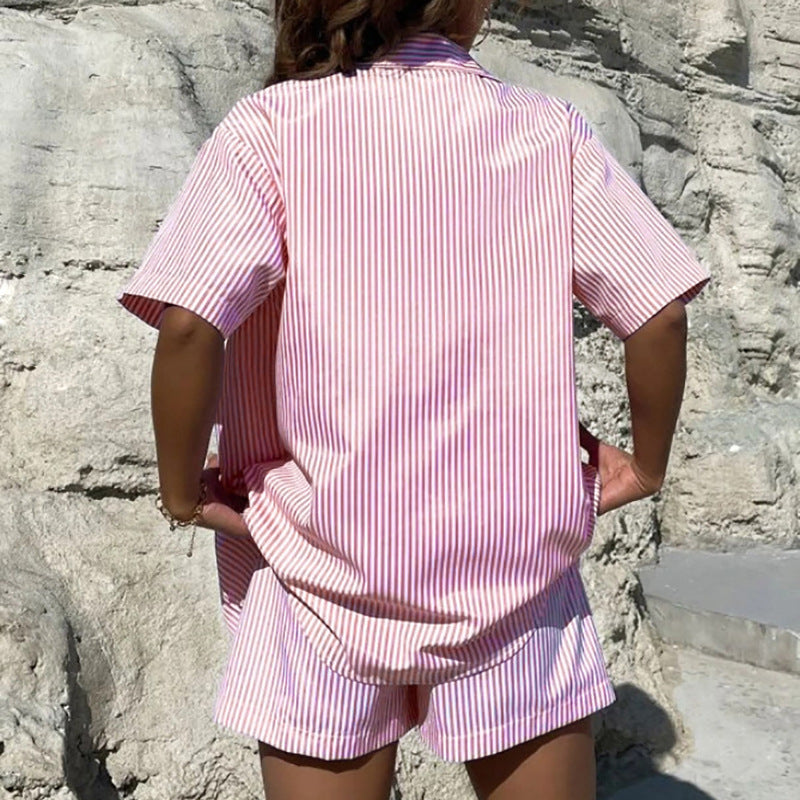 Complete your lounge wear collection with the Women's Two Piece Striped Silky Lounge Set. This set comes in a shimmery pink color accented with vertical stripes.
