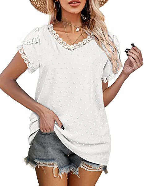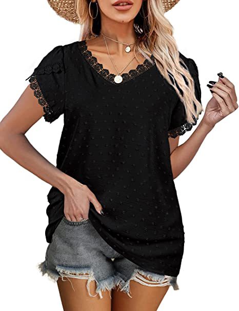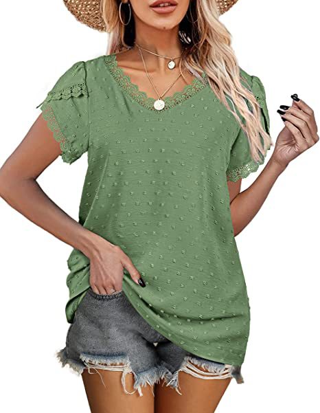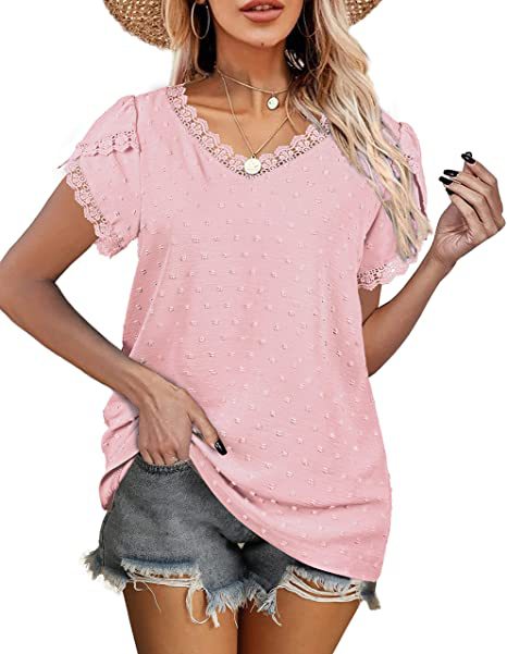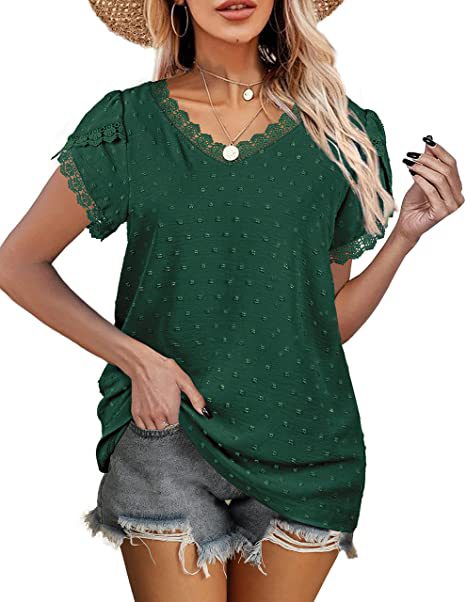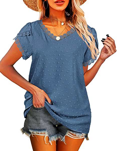 Cool and breezy, this Women's V-Neck Petal Lace Stitching ShortSleeved Tee is perfect for summer. It features lace stitching around thesleeves and the neckline and comes in six colors.