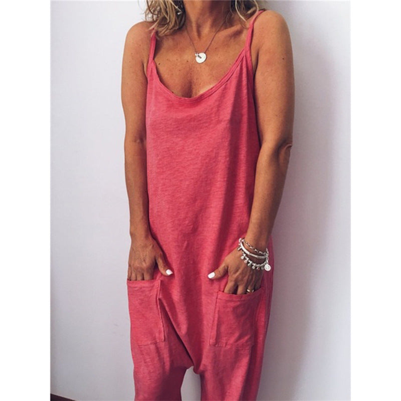 Der einteilige Damen-Jumpsuit mit Taschen und Spaghettiträgern ist eine lässige und niedliche Art, sich zu Hause oder unterwegs zu kleiden. Es ist locker geschnitten, um es bequem zu machen, sich darin zu bewegen.