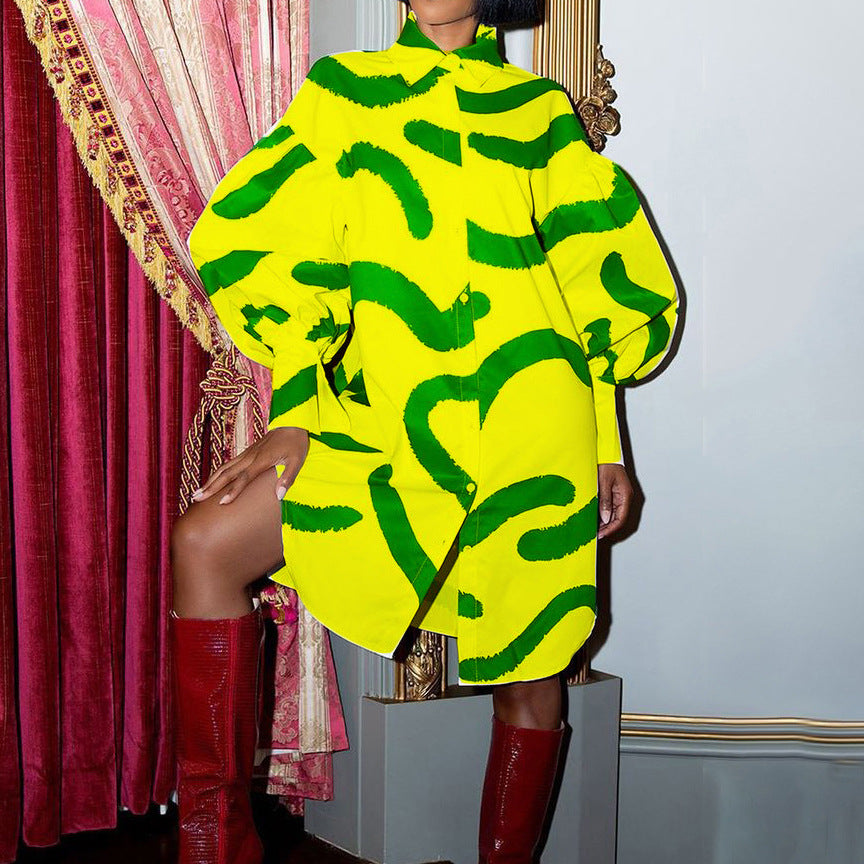 Steigen Sie vom Laufsteg auf die Straße und tragen Sie dieses auffällige und dramatische locker sitzende Minikleid mit abstrakten Streifen für Damen, das vorne geknöpft ist, große, wogende Ärmel und einen Stehkragen.