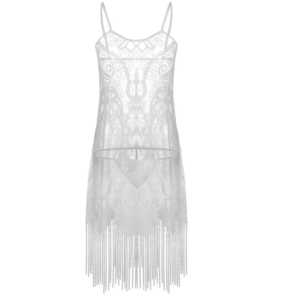 Setzen Sie ein Zeichen, wenn Sie das Zimmer mit dem Fringe Hem Lace Brocade Lingerie Set betreten, das einen durchsichtigen Spitzenkörper und lange, elegante Fransen am unteren Rand aufweist.