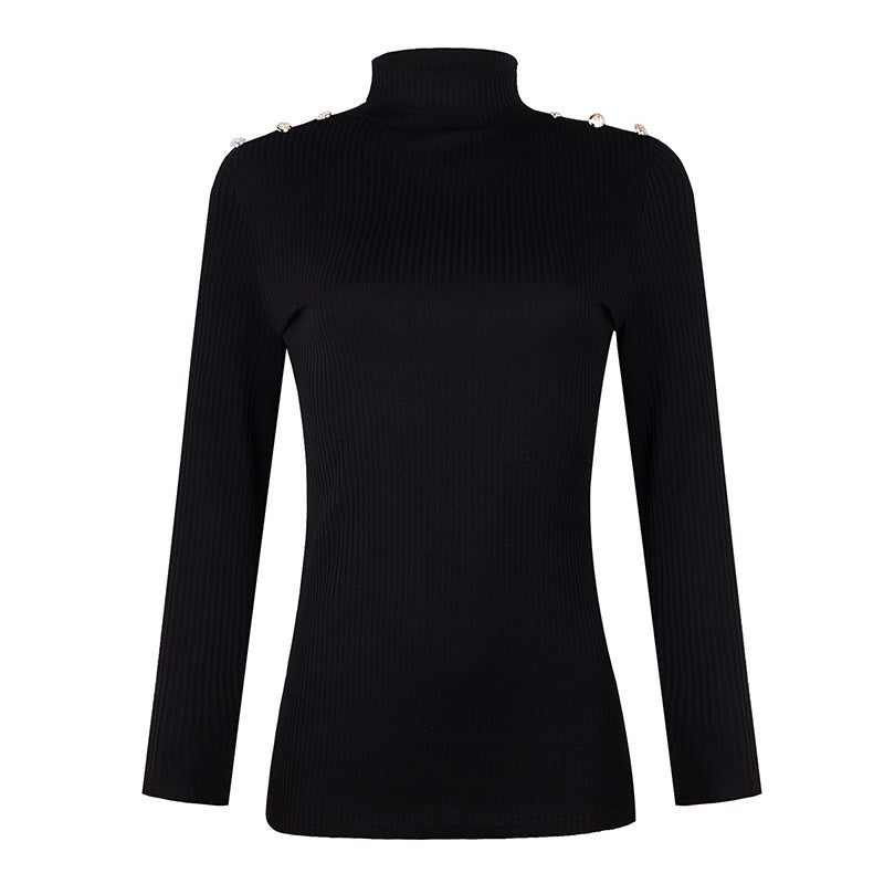 Destácate del resto este invierno y otoño con el suéter de cuello alto de manga larga para mujer con joyas. Llama la atención gracias a las grandes joyas redondas que se encuentran tanto en los hombros como en las mangas.