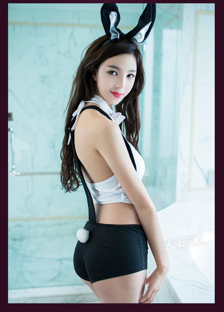 Capture el atractivo atemporal de los estilos de conejita de Playboy con el traje de conejita de lencería en blanco y negro. El traje presenta un "chaleco" con botones, un cuello abotonado separado, tirantes negros y orejas de conejo juguetonas.