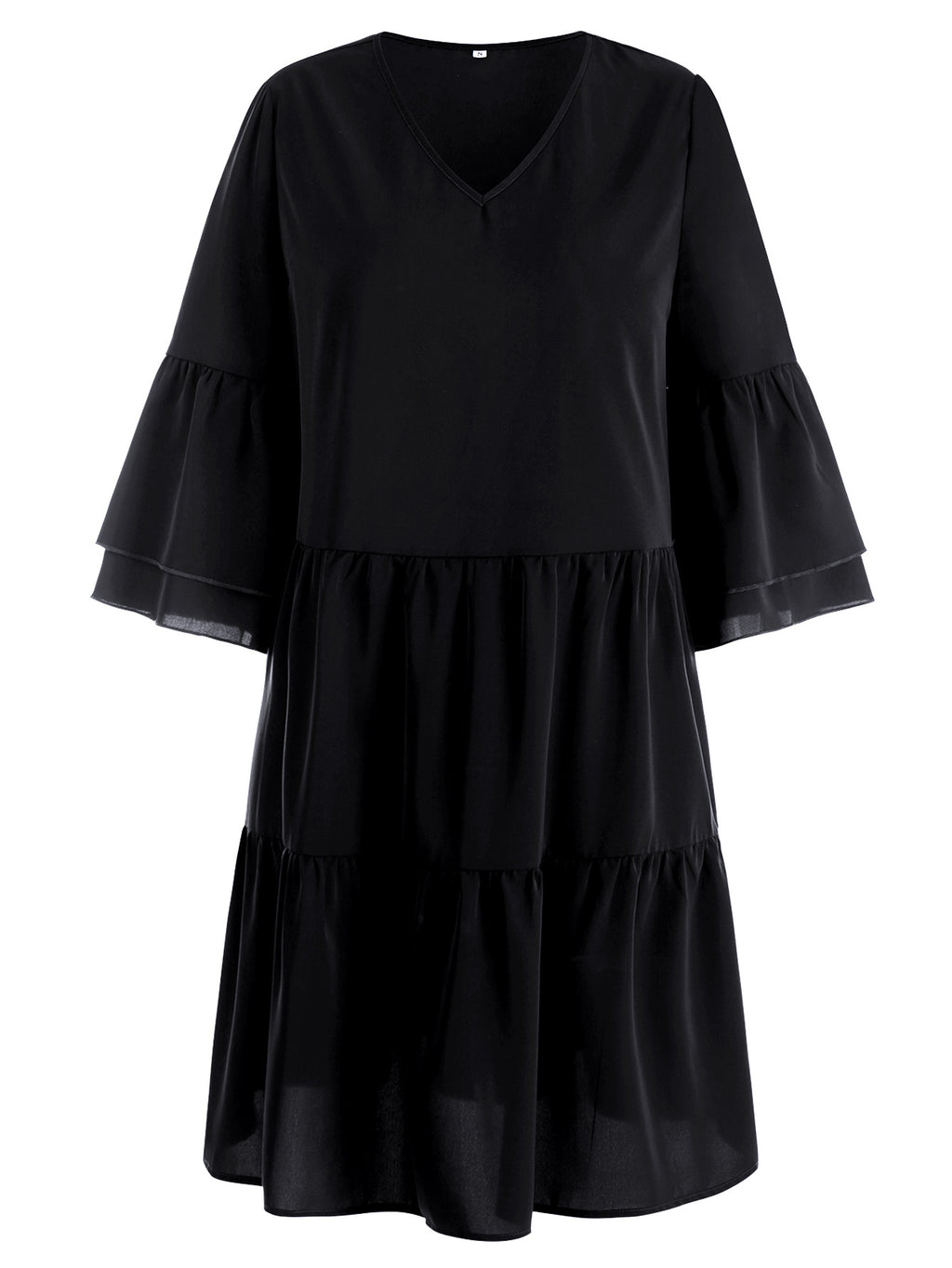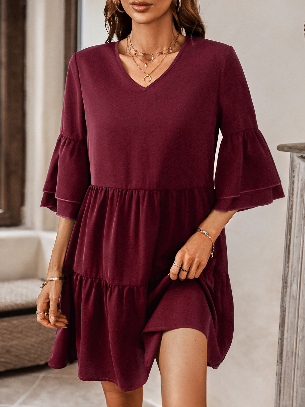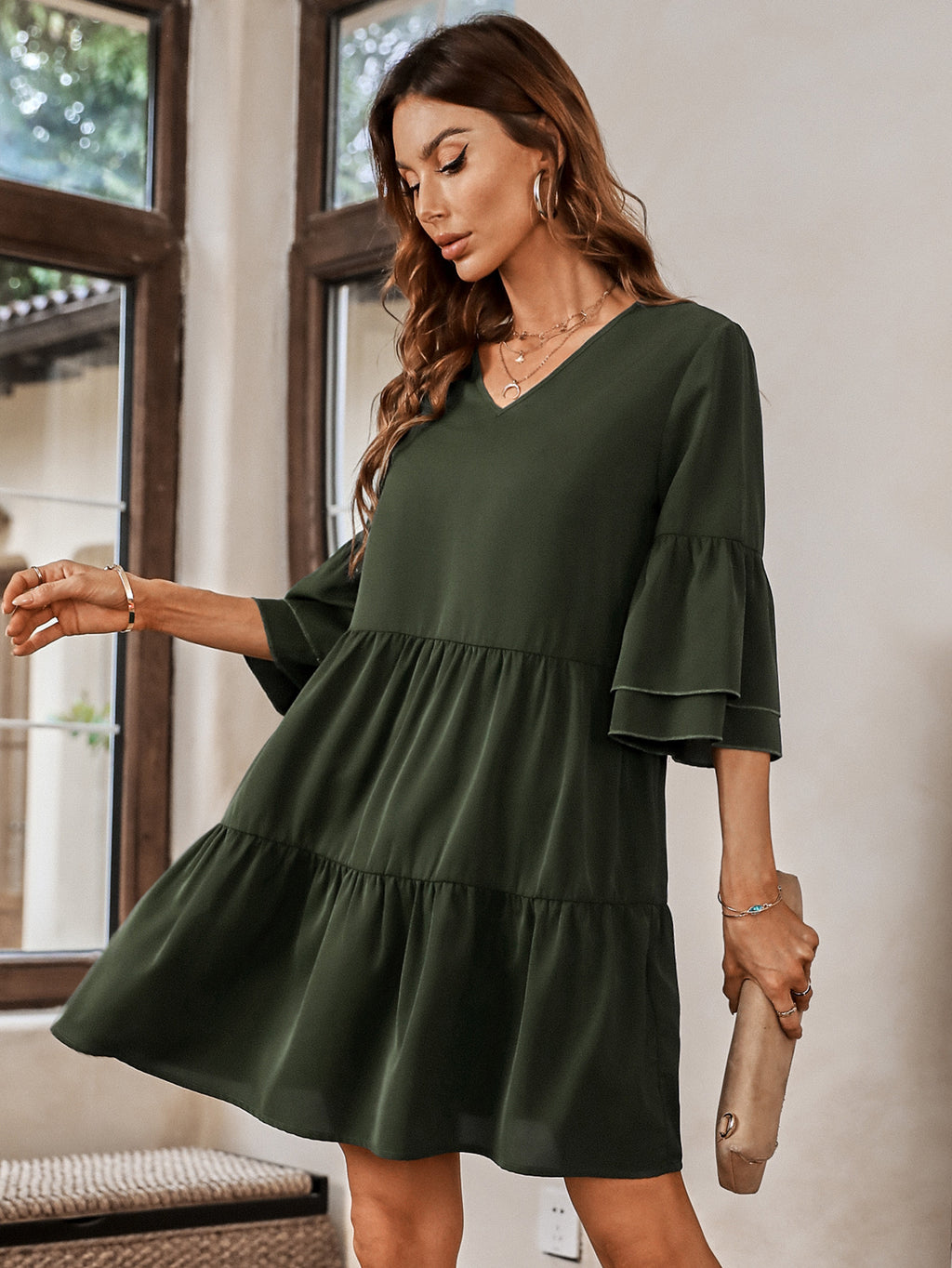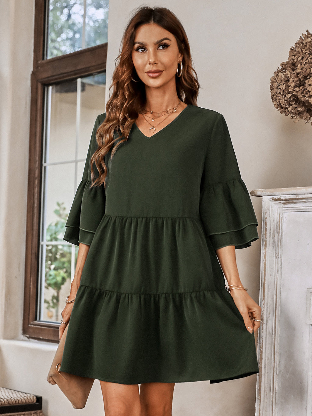 Manténgase cómodo sin importar lo que esté haciendo este verano o en el otoño con el vestido de línea A-Line Femenino con mangas con volantes. Este mini vestido presenta una falda en capas para detalles adicionales.