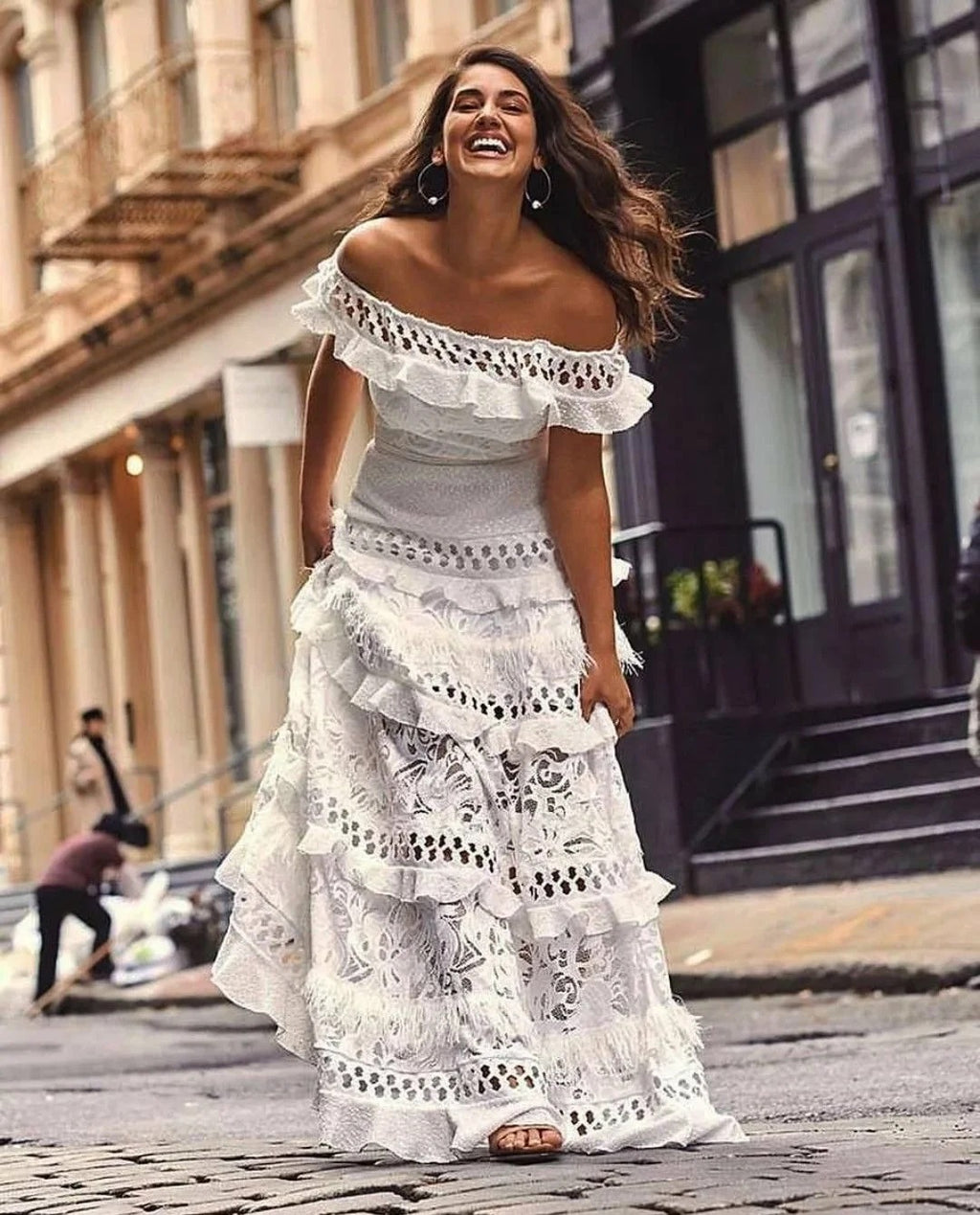 Vestido maxi escalonado de ganchillo para mujer con escote con hombros descubiertos
