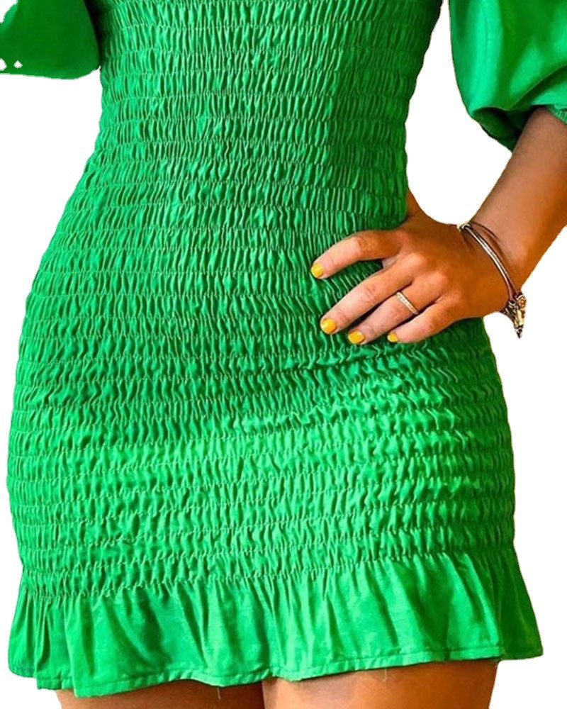 El minivestido fruncido verde lima con mangas holgadas para mujer es un vestido vibrante perfecto para el verano. Tiene un diseño de manga con hombros descubiertos que llega hasta los codos.