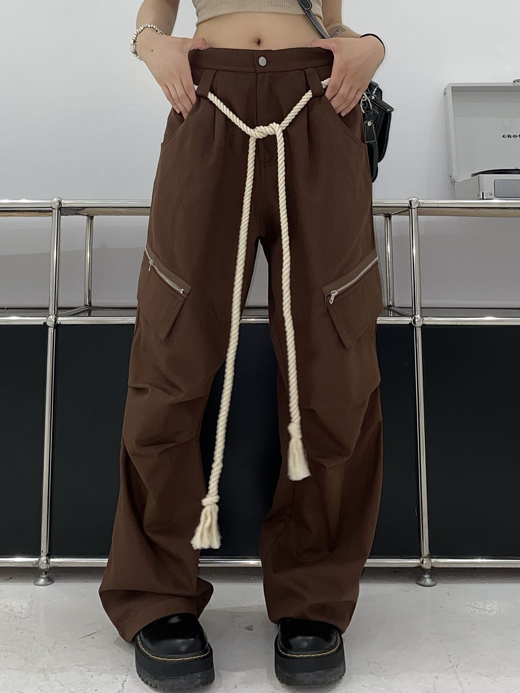 Express your personality while staying comfortable with the Women’s High Waist Baggy Pants with Oversized Drawstrings that dangle down to the ankles for a unique look.