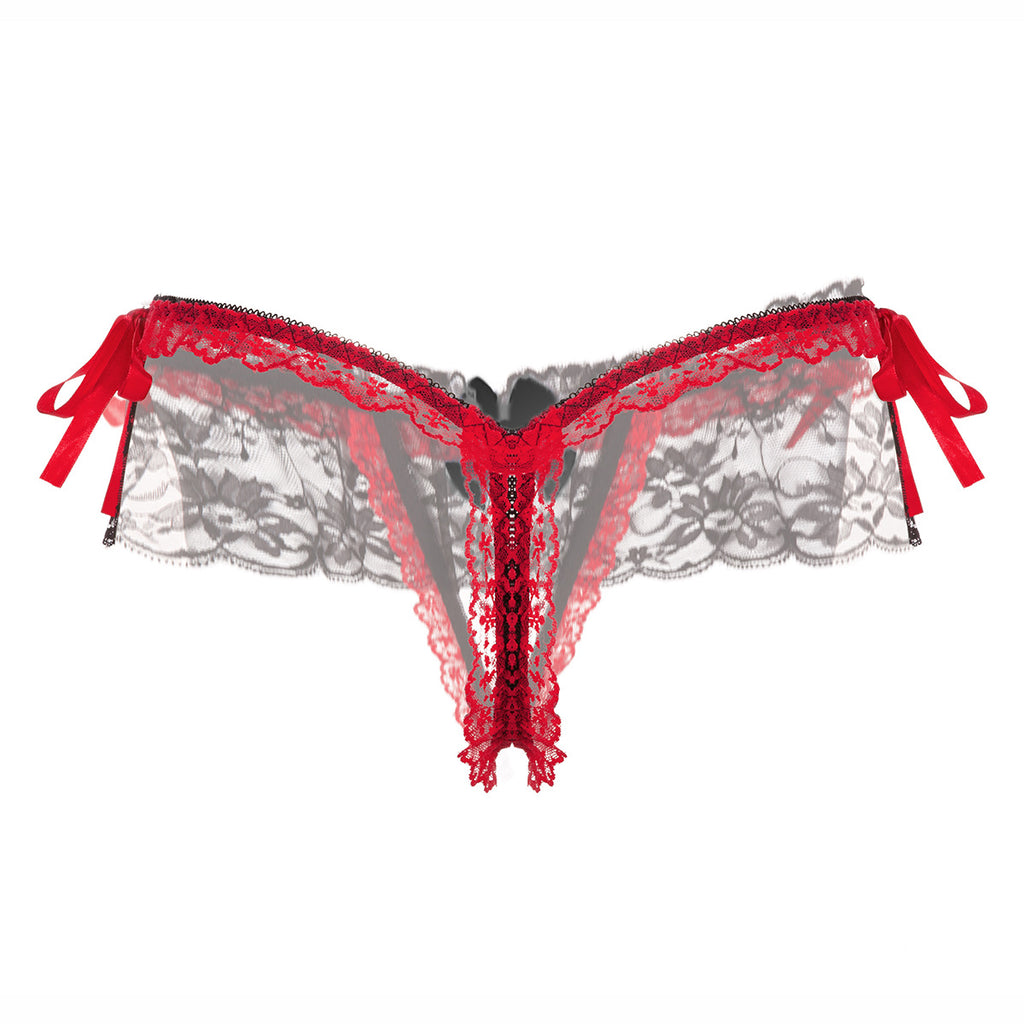 Mettez en surbrillance la forme de vos cuisses avec la culotte entre entrejambe à double garniture en dentelle avec une dentelle transparente et un arc rouge contrasté.