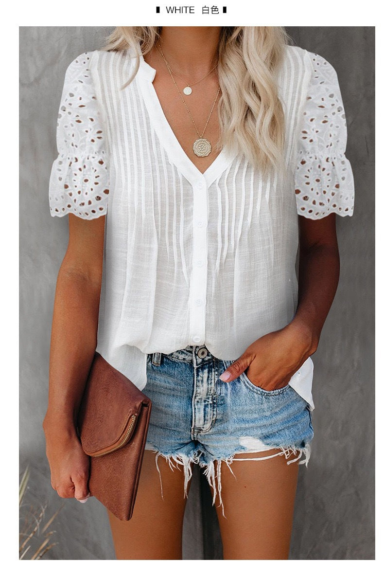 Une combinaison de matériaux semi-transparents légers et de manches en dentelle, ce chemisier décontracté féminin à manches courtes à manches courtes à manches courtes en dentelle, un choix chic et mignon.