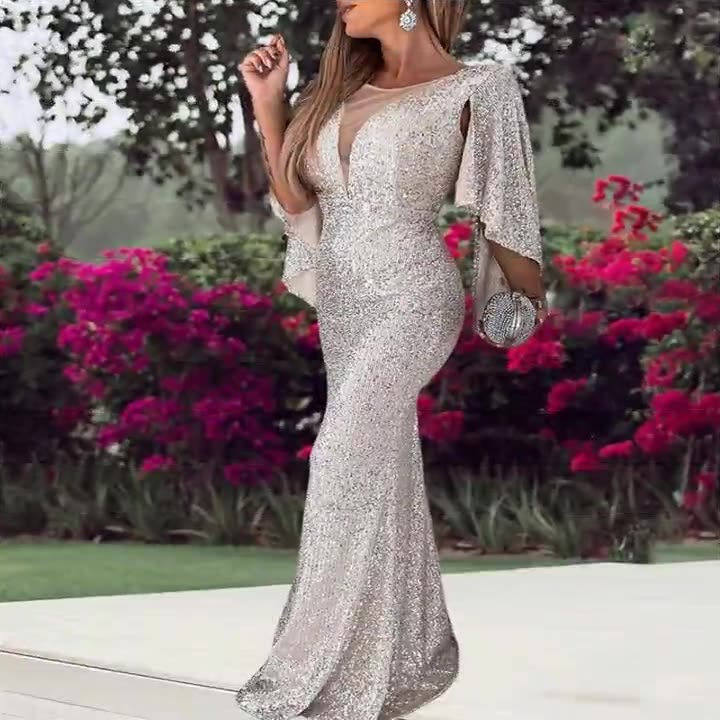 Éclat dans la lumière avec la longue robe maxi à manches longues des femmes avec un tissu ajusté. Il scintille avec son tissu argent scintillant sur une couleur de champagne soyeux et a une ligne en V basse.