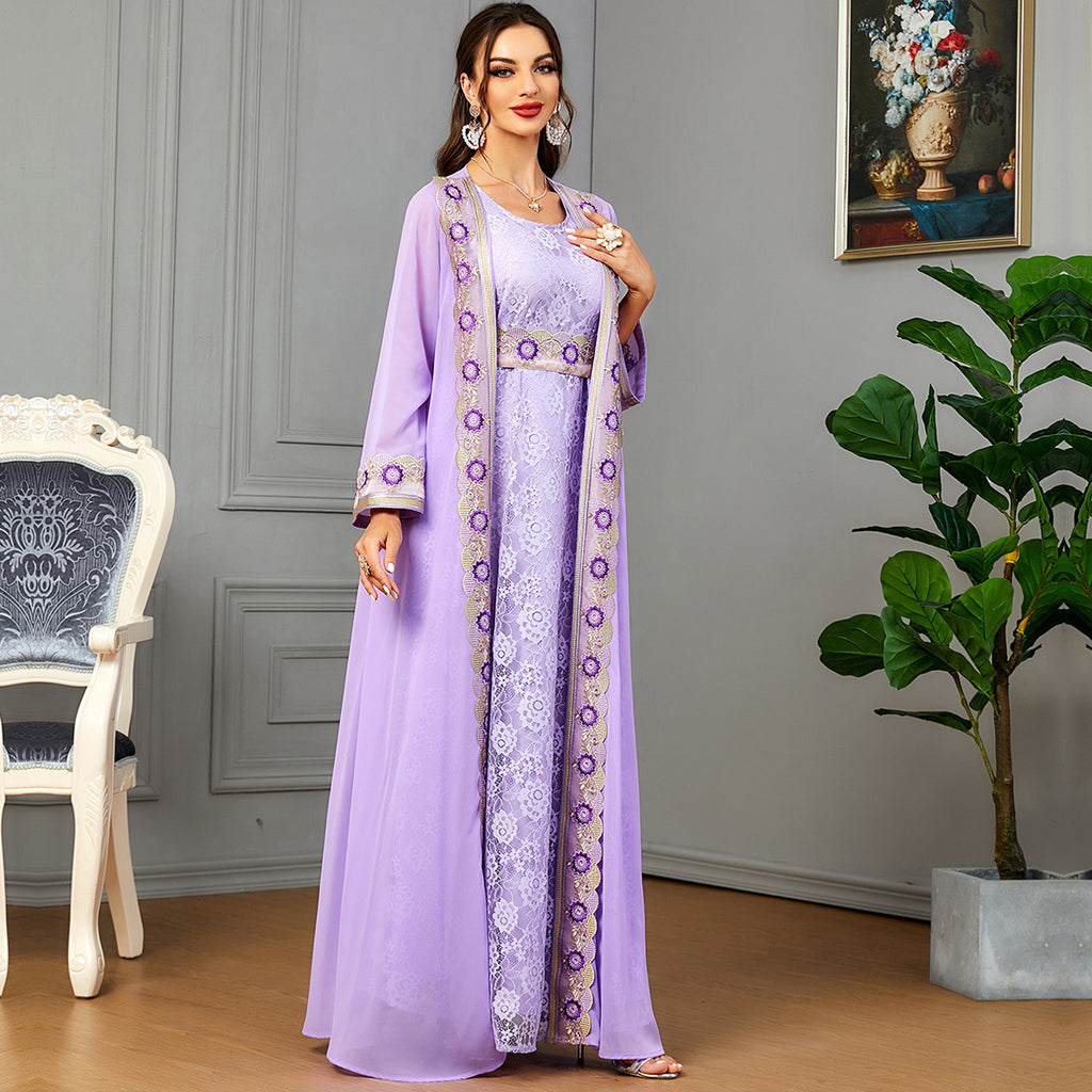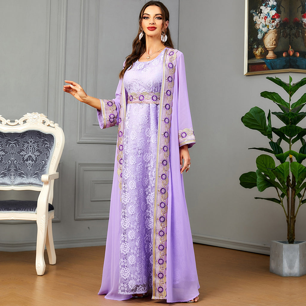 Look gorgeous at any event wearing the Women's Long Sleeve Lace Maxi Gown with Semi-Sheer Robe. It consists of various shades of purple for a layered look.