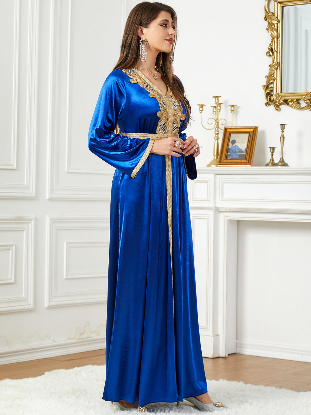 Whether you choose the light blue color, the dark blue or purple, the Women's Long Sleeve Velvety Dress with Golden Details is sure to flatter you.