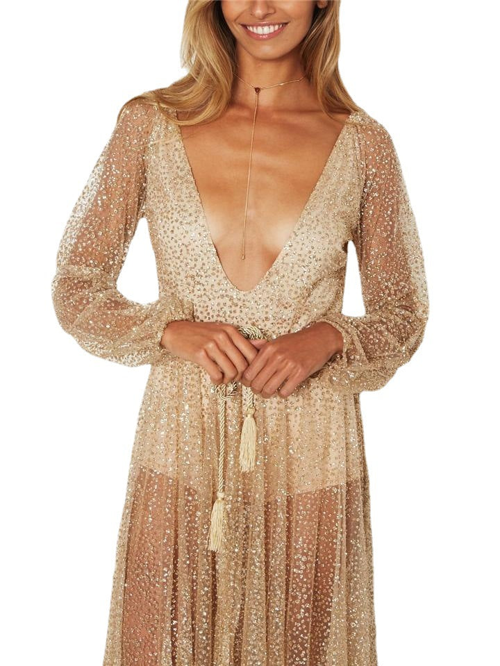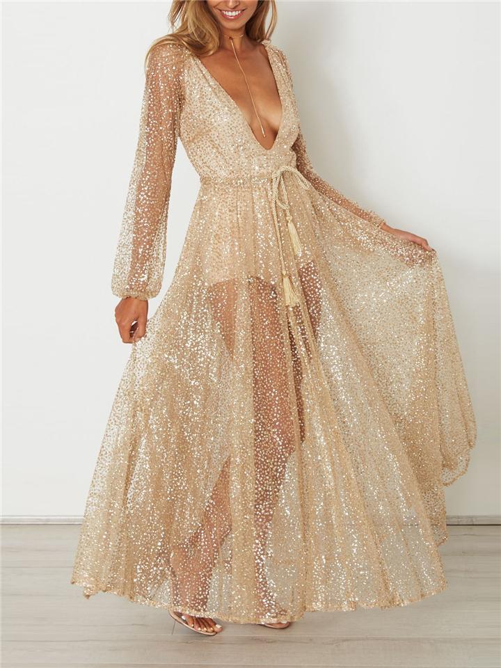 अर्ध शेर सामग्री और लंबी आस्तीन के साथ इस महिला की खड़ी वी-गर्दन पोशाक पहने किसी भी औपचारिक घटना में अपना सर्वश्रेष्ठ देखें। यह जांघों और हथियारों के साथ-साथ एक तेज वी-नेक के साथ कपड़े के माध्यम से समेटे हुए है।