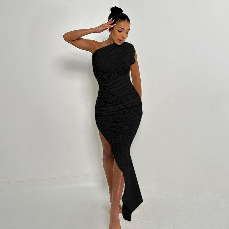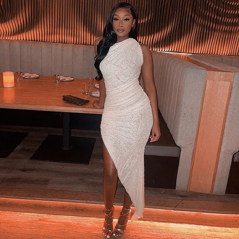 अपने अगले औपचारिक कार्यक्रम में अपना सर्वश्रेष्ठ देखें, जो महिलाओं के कंधे की विषम हेम मैक्सी ड्रेस के साथ एक बुना हुआ बनावट है और काले या सफेद रंग में आता है।