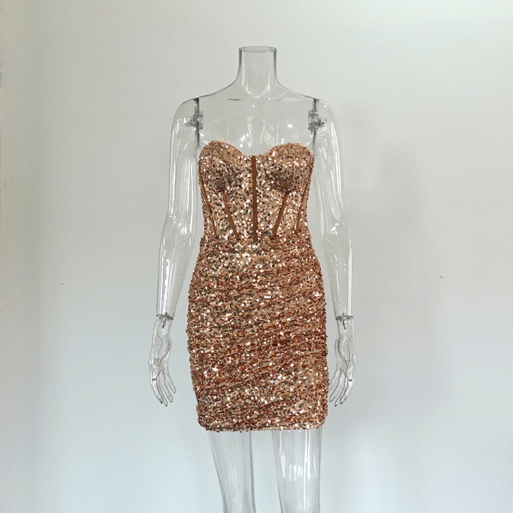 Menonjol di klub mengenakan gaun mini bodycon berkilauan wanita dengan tulang korset. Gaun strapless ini menampilkan hem mini pendek dan hadir dalam dua warna.
