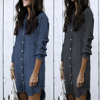 Gaun kancing denim lengan panjang wanita memberikan penampilan bersantai dalam tshirt kancing yang terlalu besar, menawarkannya tampilan yang penuh gaya dan sedikit memikat. Mereka datang dalam beberapa pilihan warna.