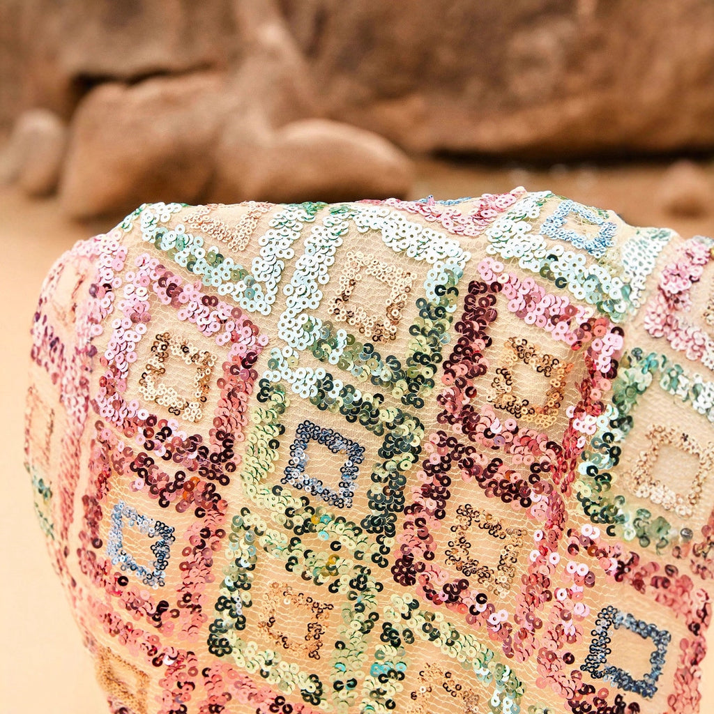 Menonjol di rok pendek ini dengan jahitan payet geometris dan lapisan glitter. Sempurna untuk pesta, pertunjukan, atau menambahkan kilauan pada tampilan malam Anda.
