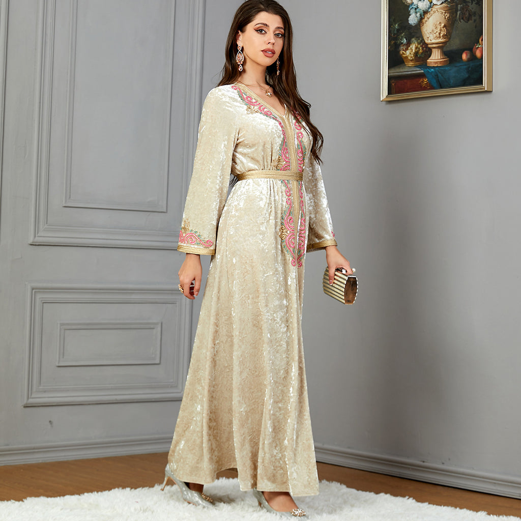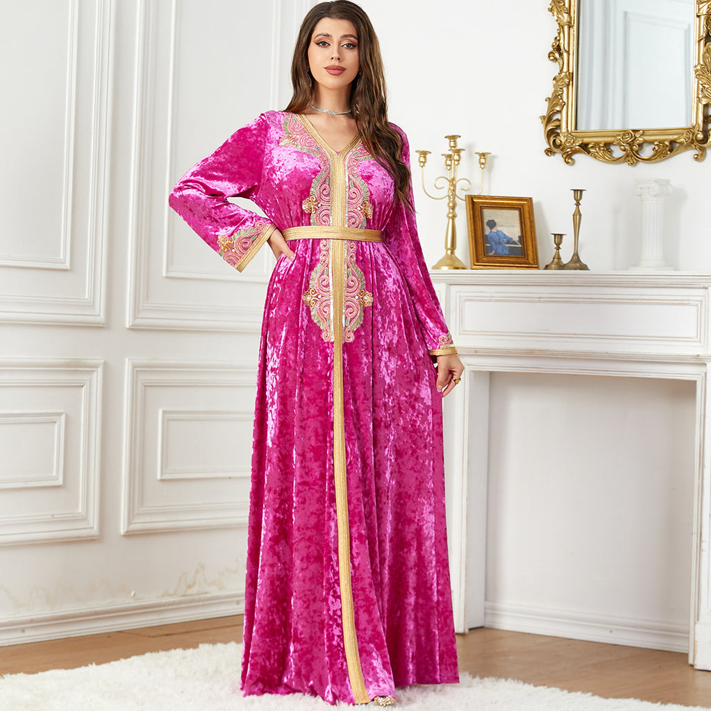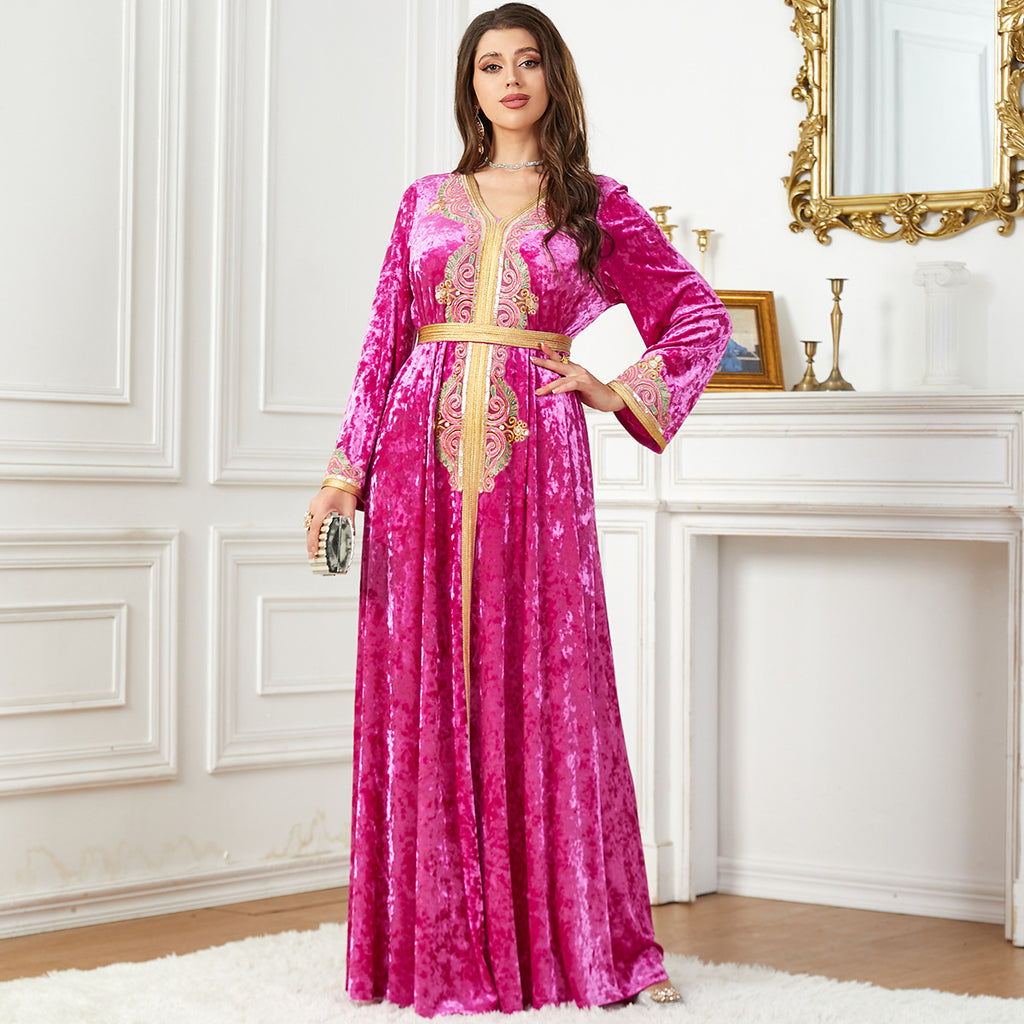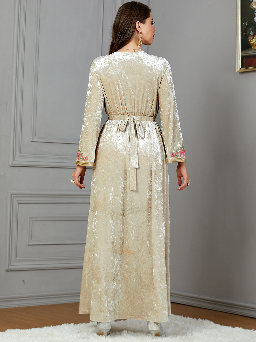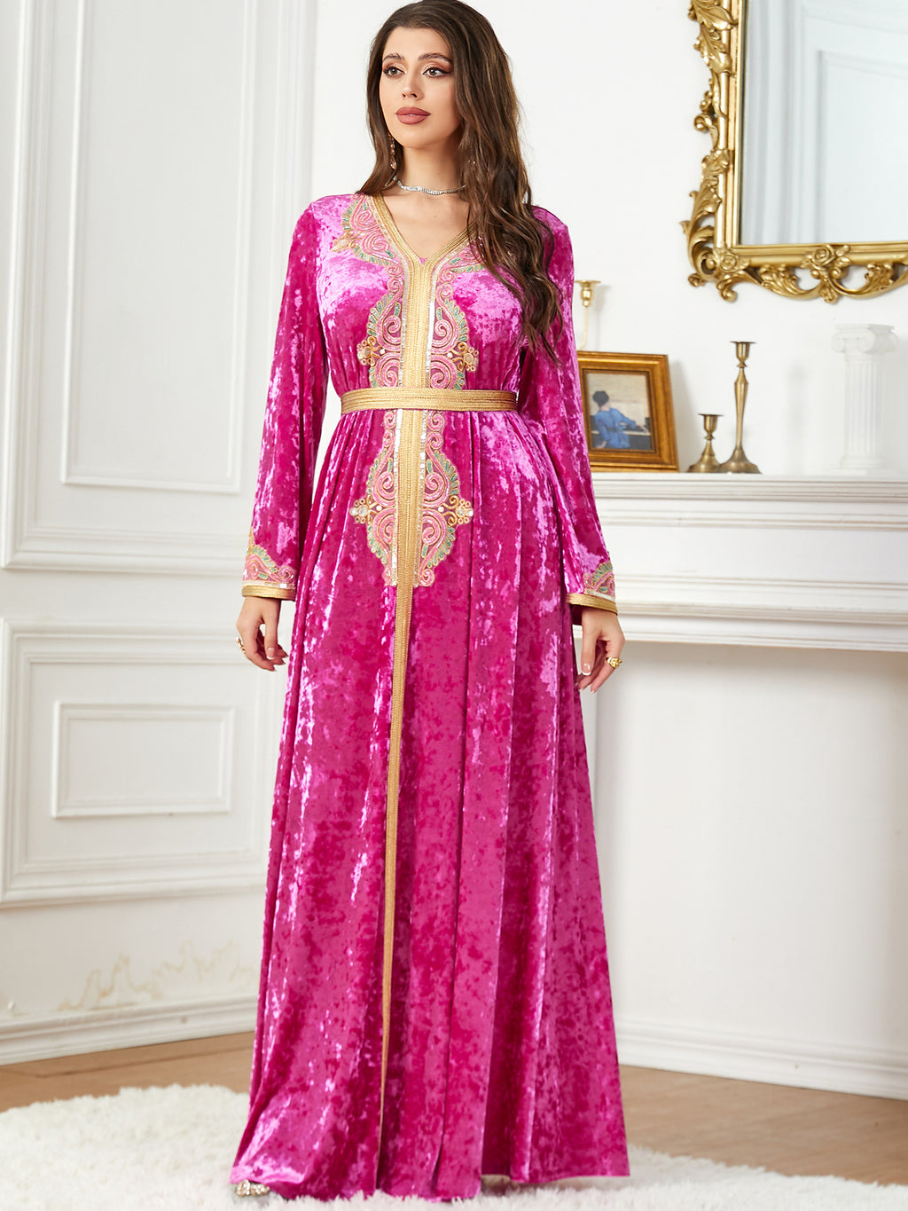 Women's Long Sleeve Velvet Maxi Dress with Gold Trim