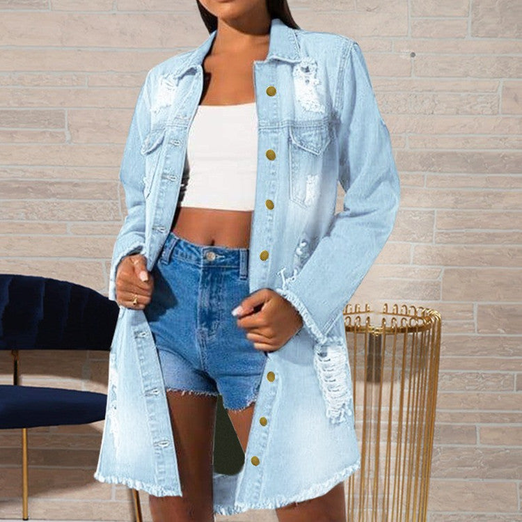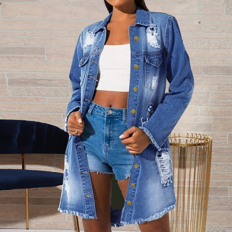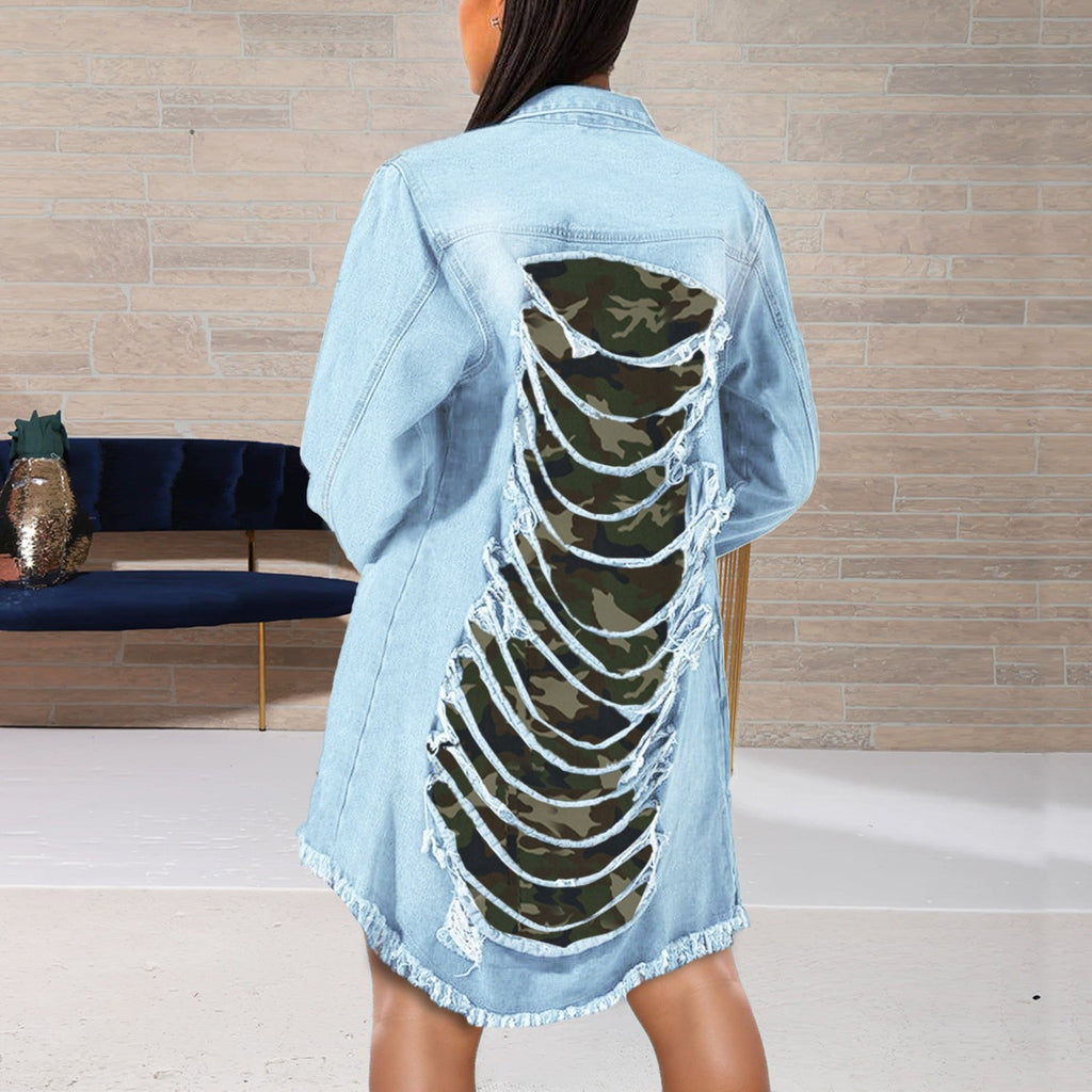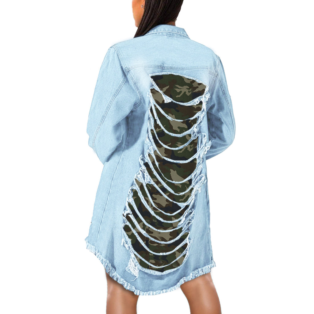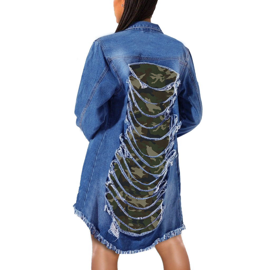 Gira la testa ovunque tu vada con la lunga giacca di jeans strappata con motivi mimetici. Questa giacca jeans è caratterizzata dal suo retro strappato in cui il tessuto a stampa mimetici può essere visto sbirciare.