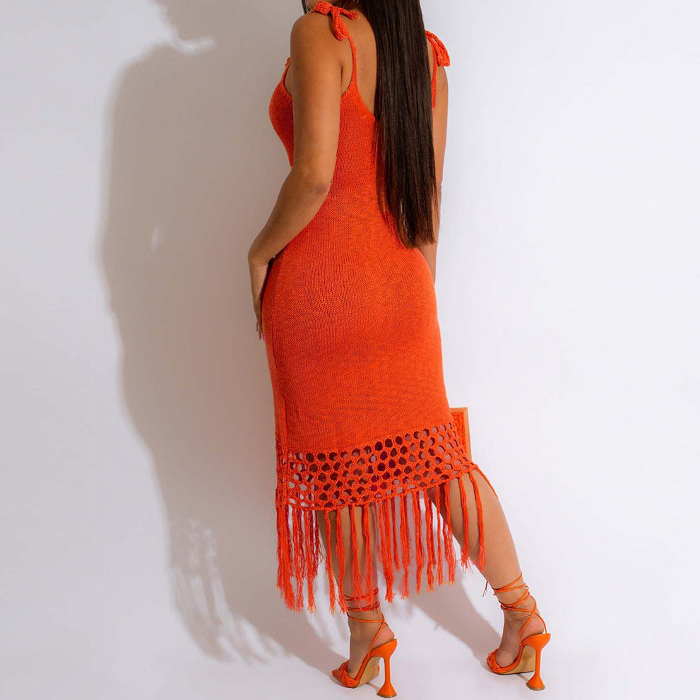 Women's Strappy Maxi Dress with Netting and Tassels
