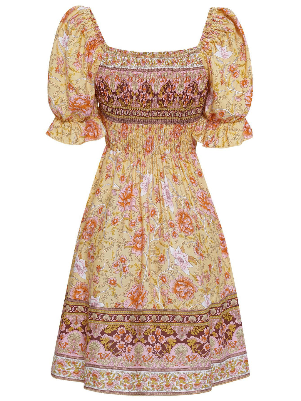 カントリーシックなパターンとふくらんでいる堤防を備えたこの女性の自由hohoのシックな半袖ミニサンドレスで自分を表現してください。 3つの色とパターンオプションのいずれかから選択します。