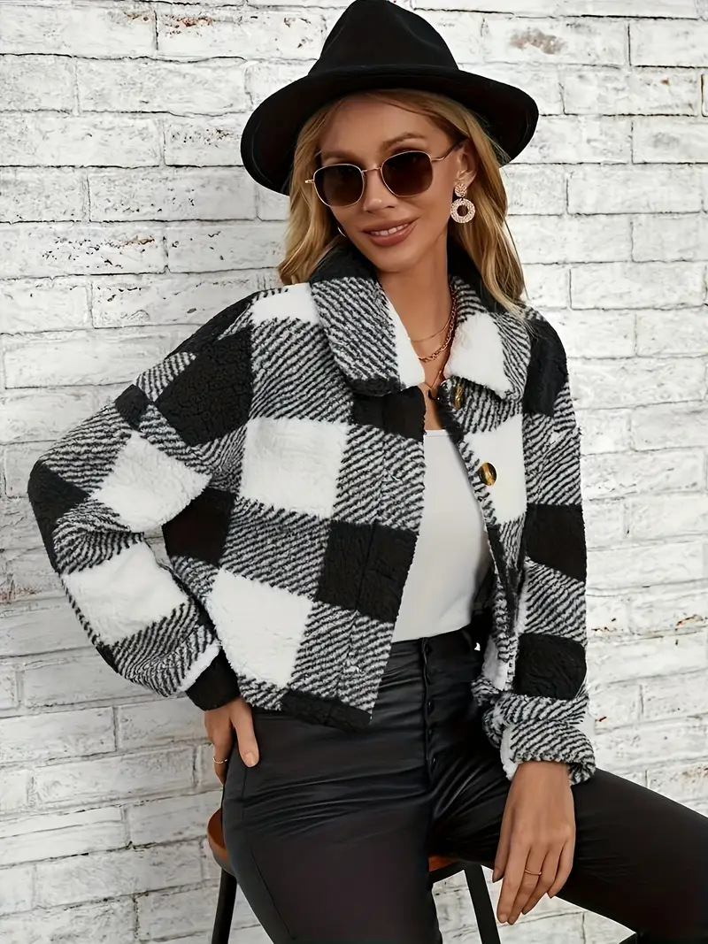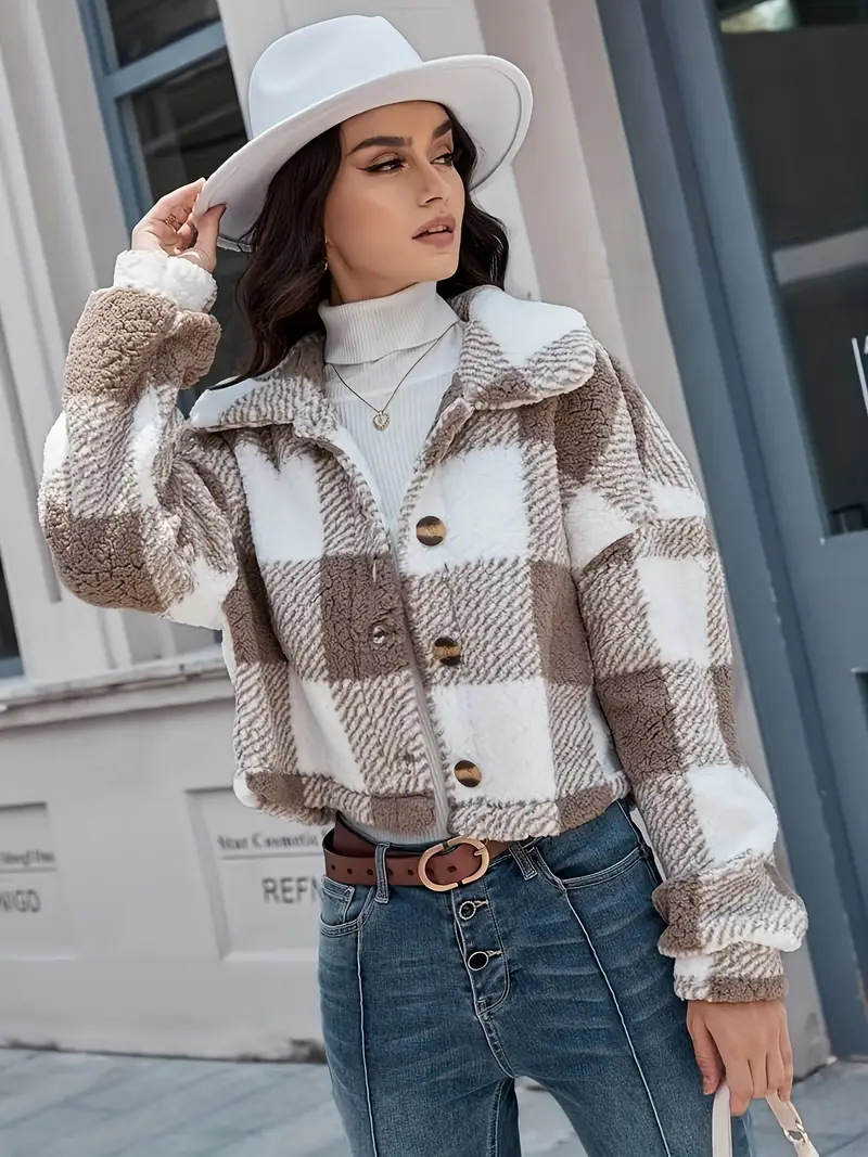 Cozy plaid plush cardigan coat with button-front closure and thick insulation for cold days. The loose silhouette and soft polyester make it a comfortable, stylish outer layer for casual or social occasions.