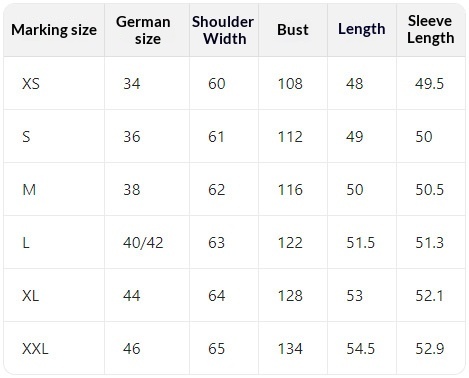 • Length (M): ~36–40 in / 91–102 cm; Chest (M): ~42 in / 107 cm