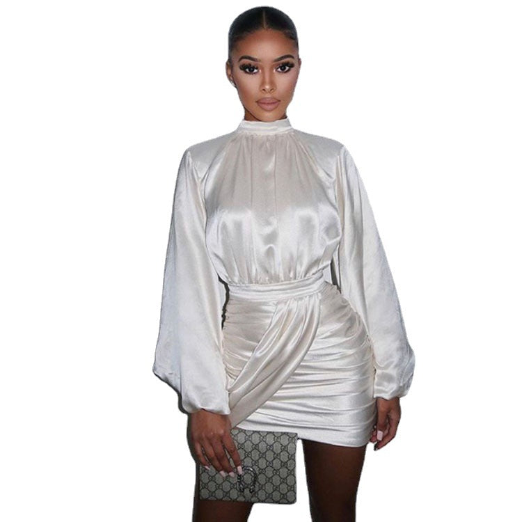 モックネック付きの女性の長いパフスリーブミニドレス
