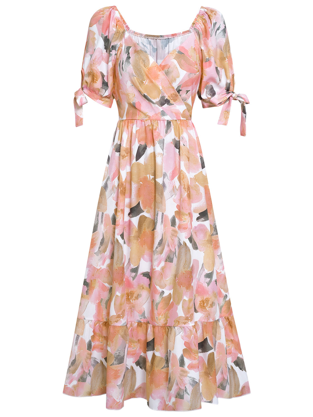 女性の半袖の花柄のプリントミディドレスを着て春の精神を身につけ、恋人のネックラインと袖の周りにネクタイを備えたユニークな仕上げの仕上げを特徴とします。