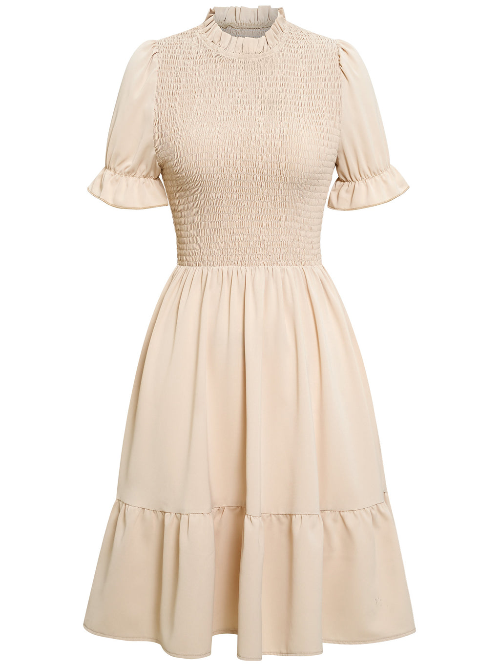 Casual maar chic, de korte Midi -jurk voor dames met ruches met ruchesom is een geweldige metgezel voor je lentetijduitjes. Kies uit een van de drie zachte pasteltinten.