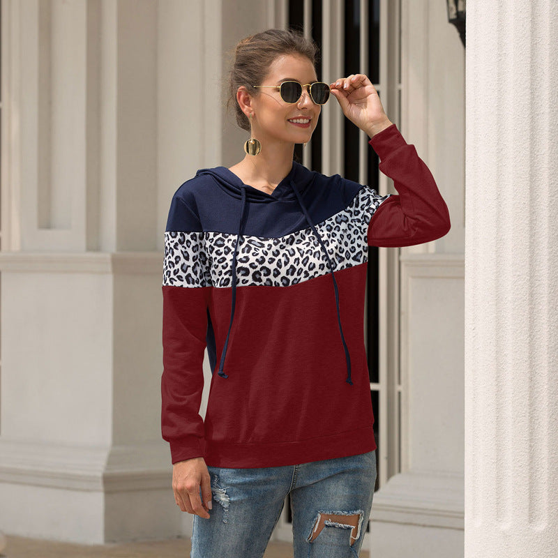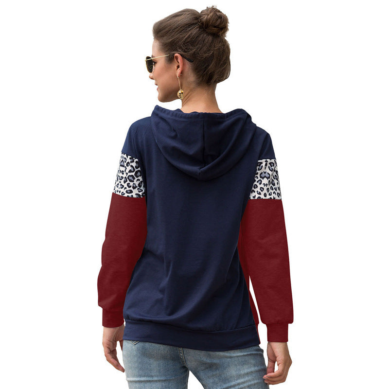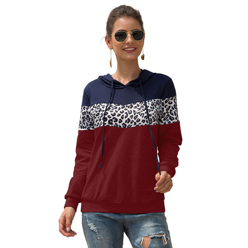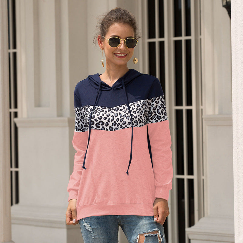 Voeg wat kleur en leven toe aan je dagelijkse kleding met het hoodie -shirt van de dames met lange mouwen met capuchon en trekken. Het shirt is onderverdeeld in drie kleurenblokken met dierenprint voor en in het midden.