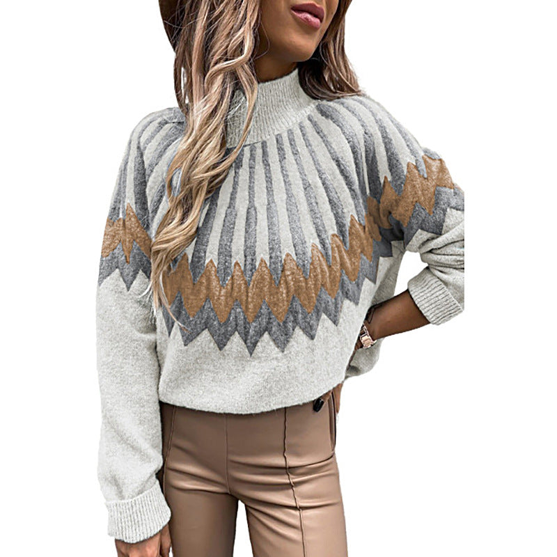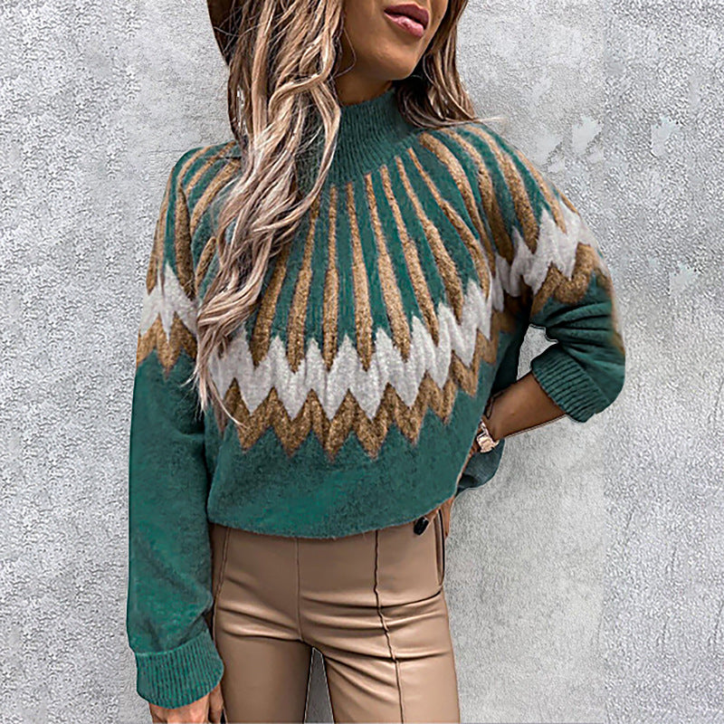 Kleed je om indruk te maken deze winter en herfst met de losse trui van de dames passende antieke stijl met coltrui. Het wordt gekenmerkt door zijn kunst deco-geïnspireerde patroon langs het lijfje en de mouwen van de trui.