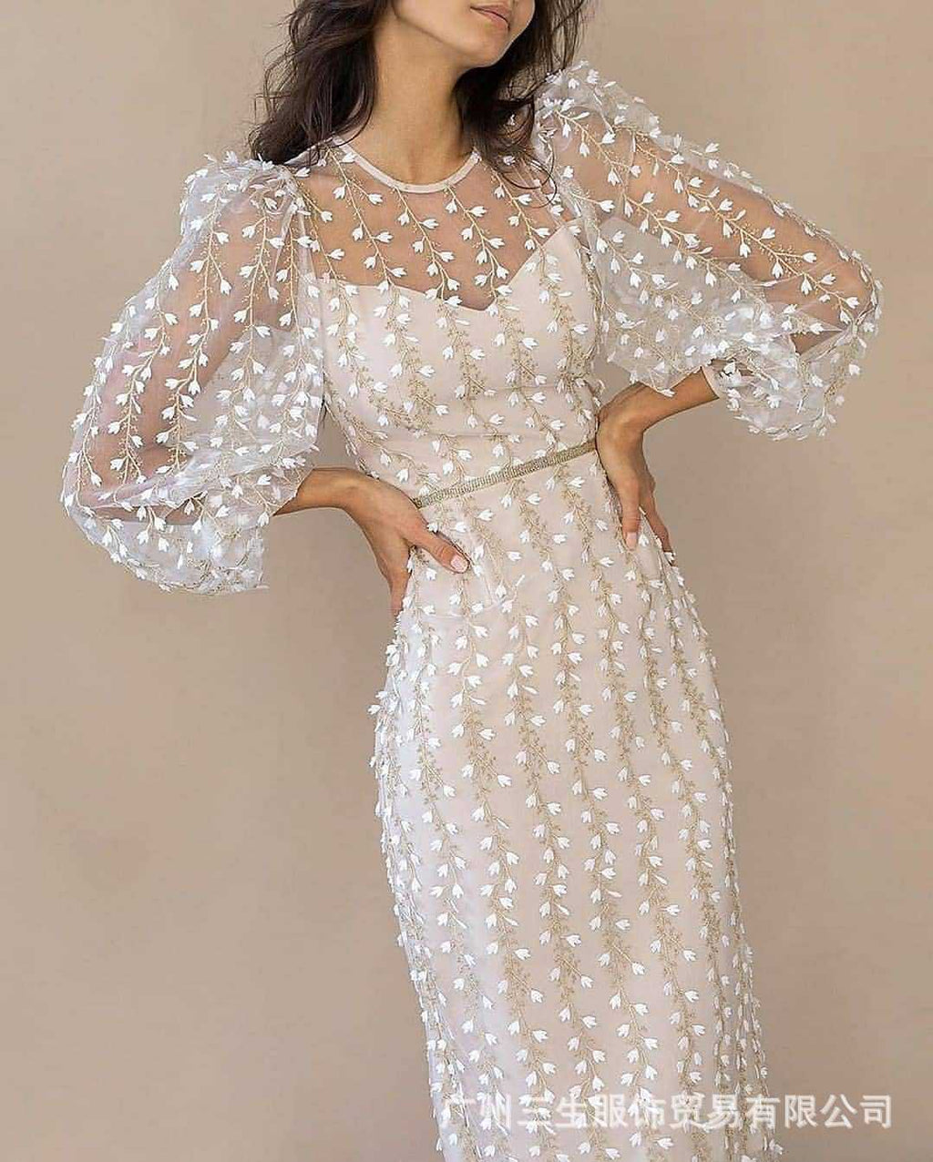 Het dragen van de witte jurk van de dames met polka dot semi-sheer materiaal is een opvallende jurk die net goed genoeg past om de vorm van de jurk te geven. Het heeft een midi -zoom die net onder de knie zit.