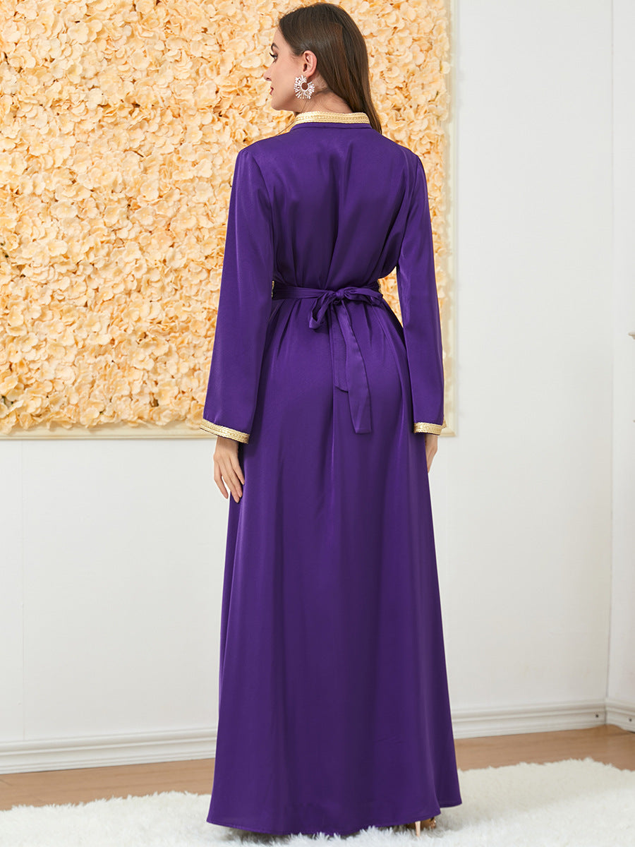 Elegant en verfijnd, de damescream maxi -jurk met marineblauw gewaad is een vorstelijke keuze voor elk evenement. Deze jurk bevat gouden details langs zowel de jurk als het gewaad.