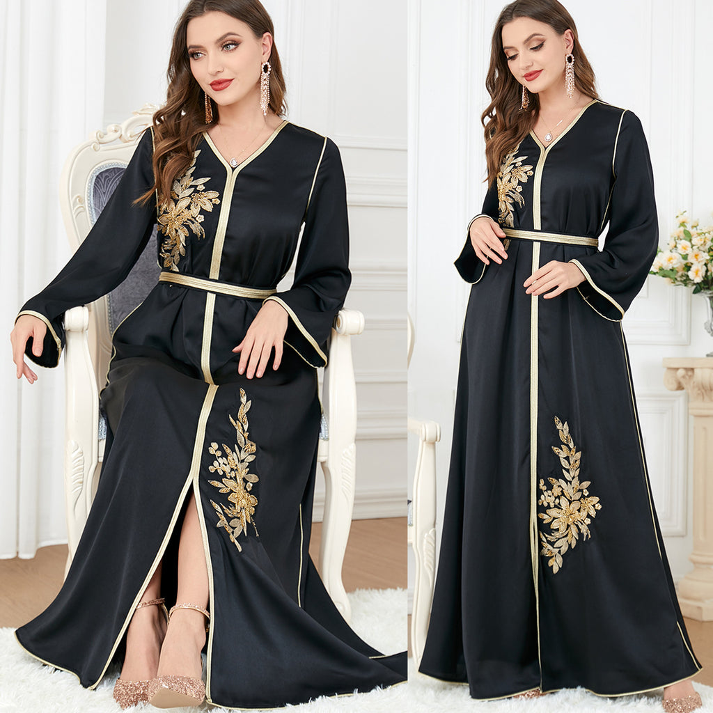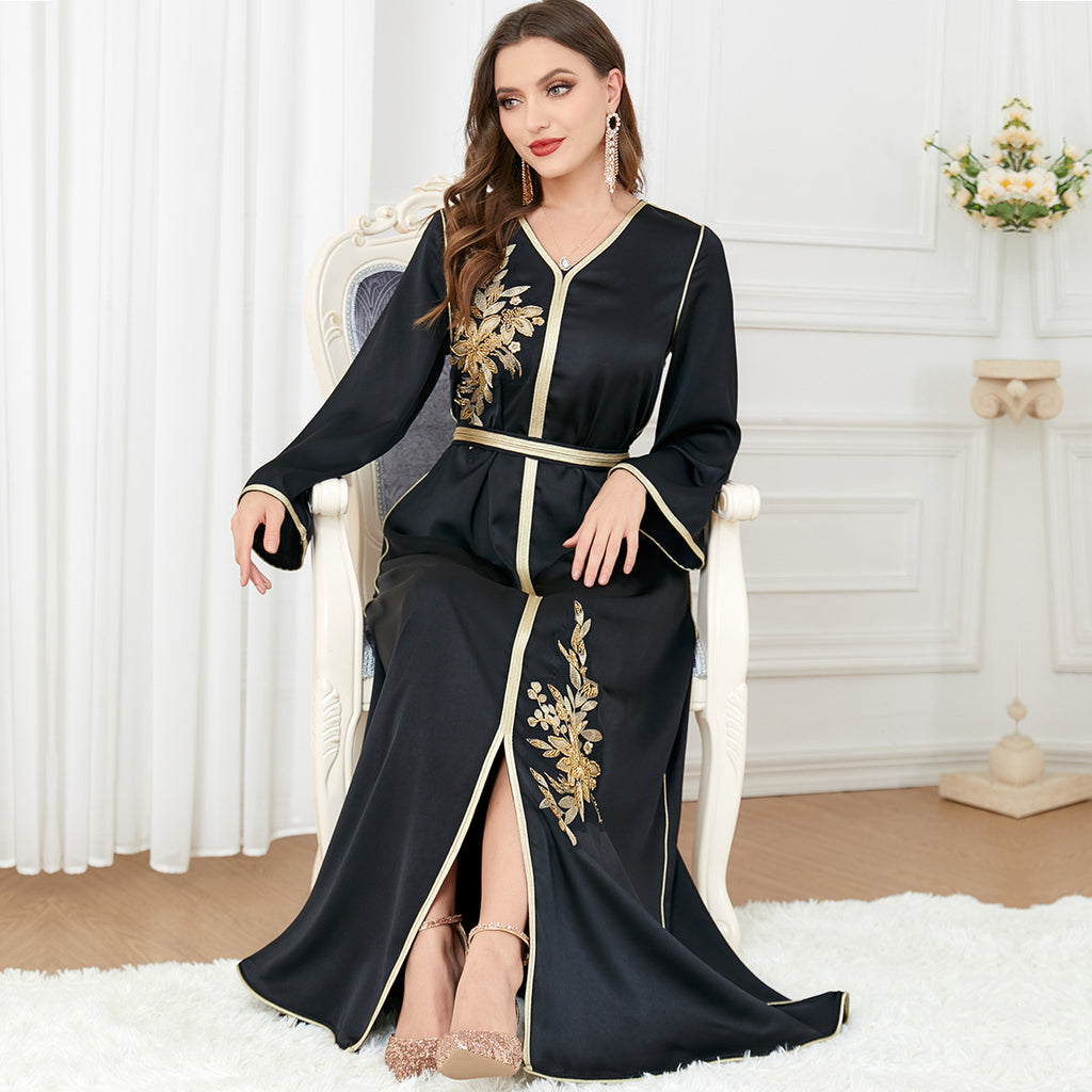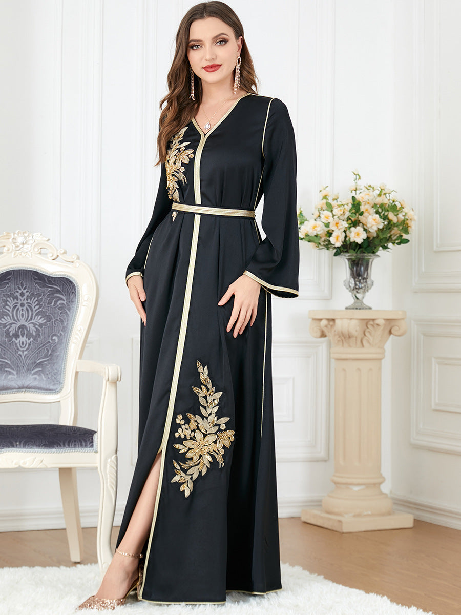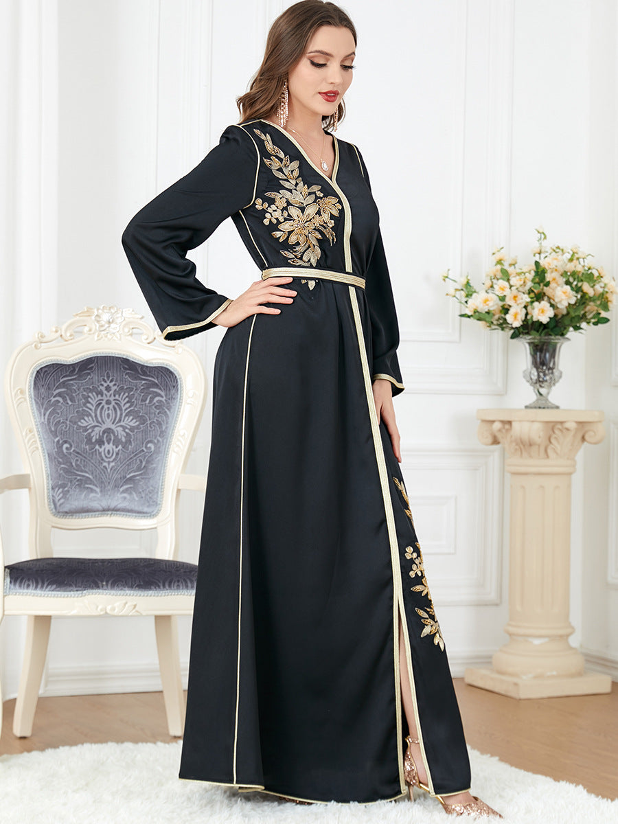 De zwarte en gouden maxi-jurk met lange mouwen van de vrouwen is een verfijnde en elegante jurk met opvallende gouden botanische details en bijpassende gouden afwerking.