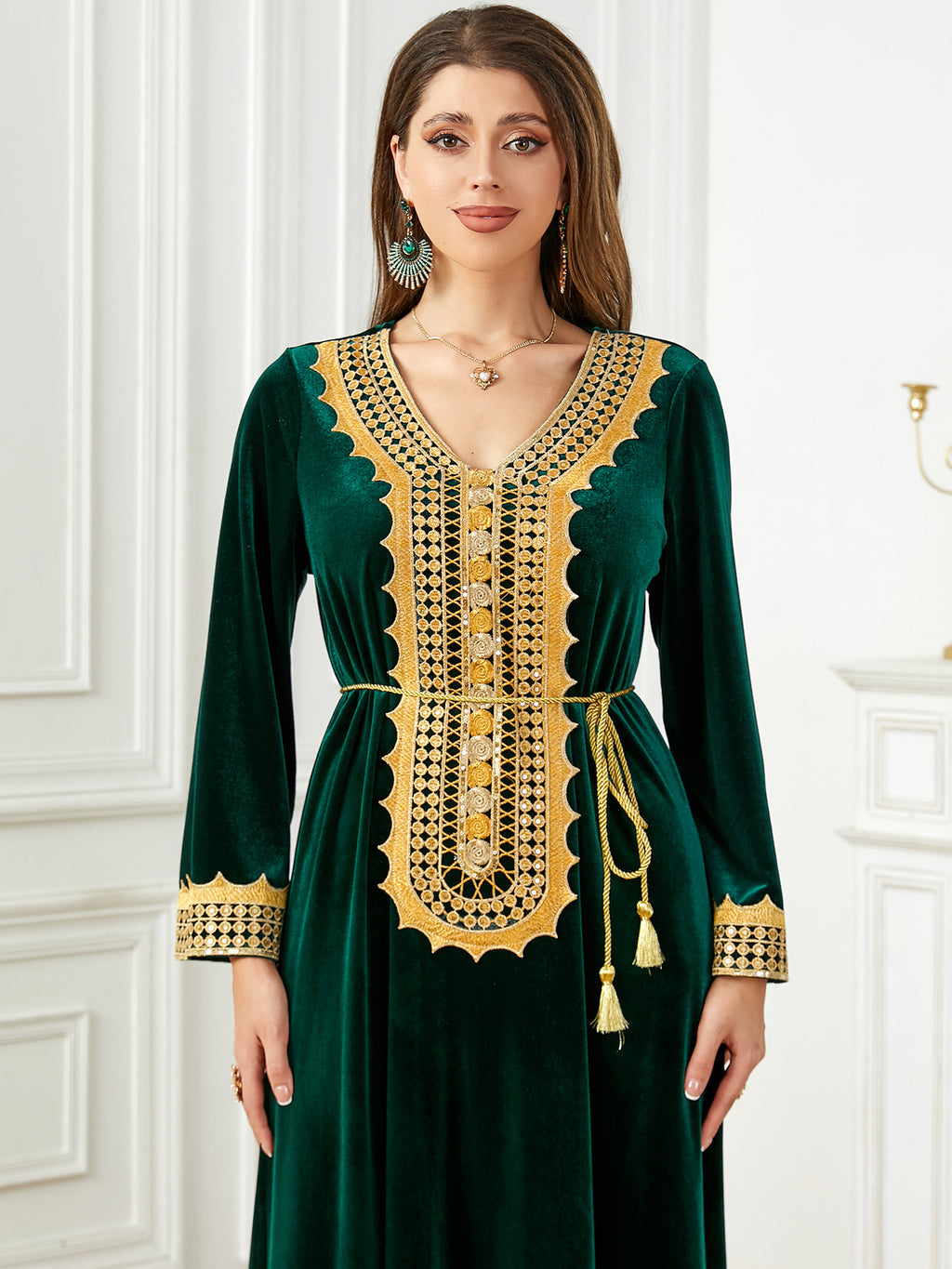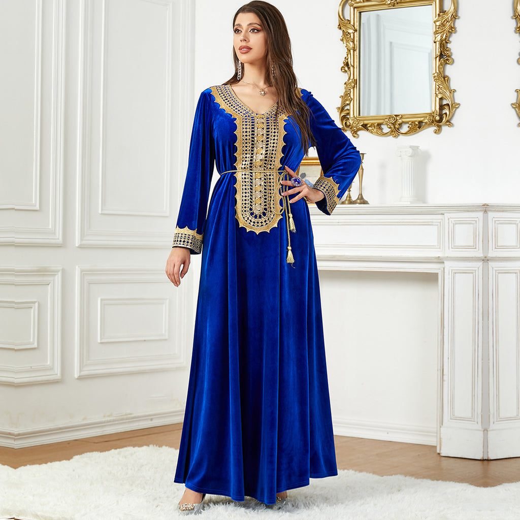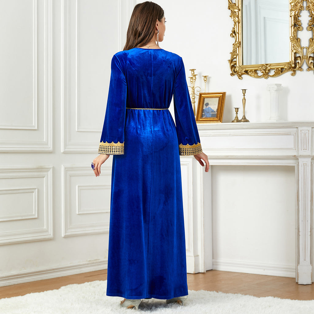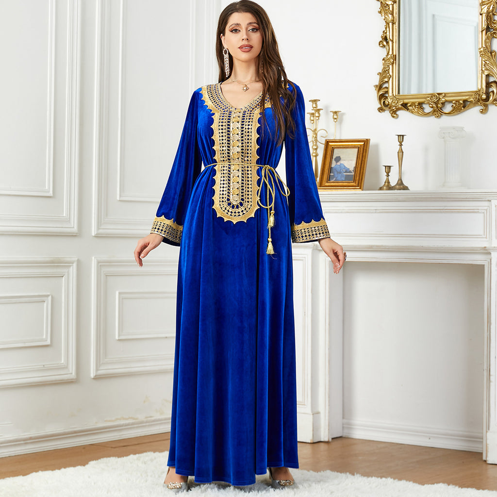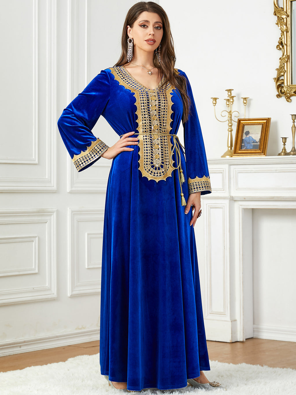 Ziet er prachtig uit bij elk evenement met de maxi -jurk met lange mouwen met de dames met kwastriem. Deze rijke blauwe jurk heeft gouden details langs het lijfje en de mouwen.