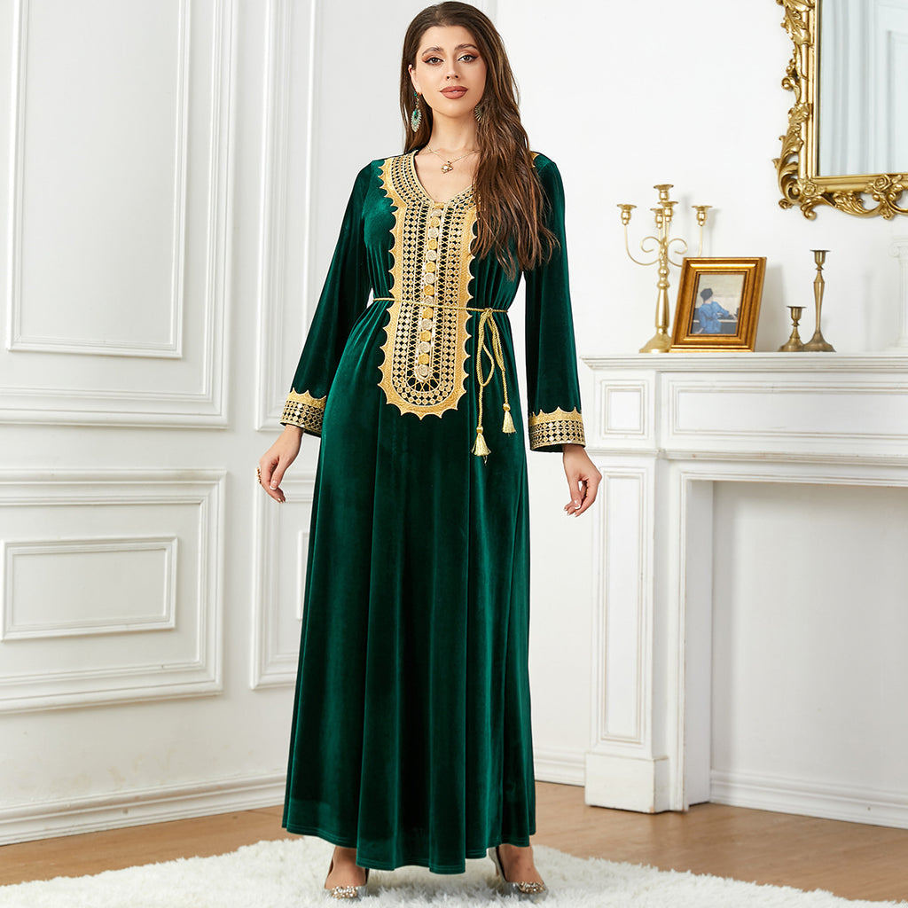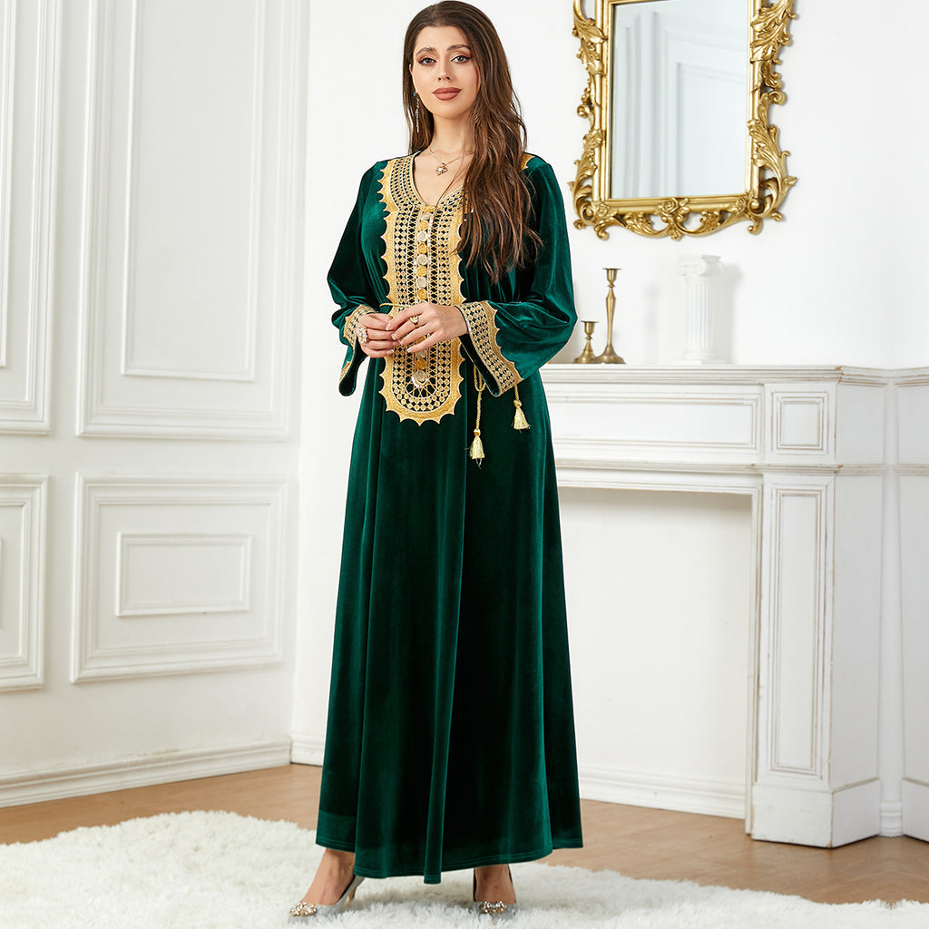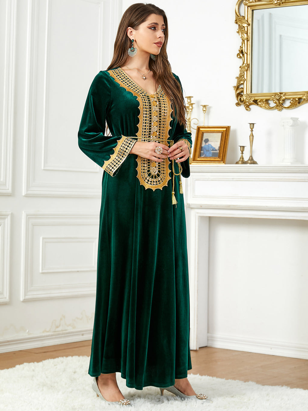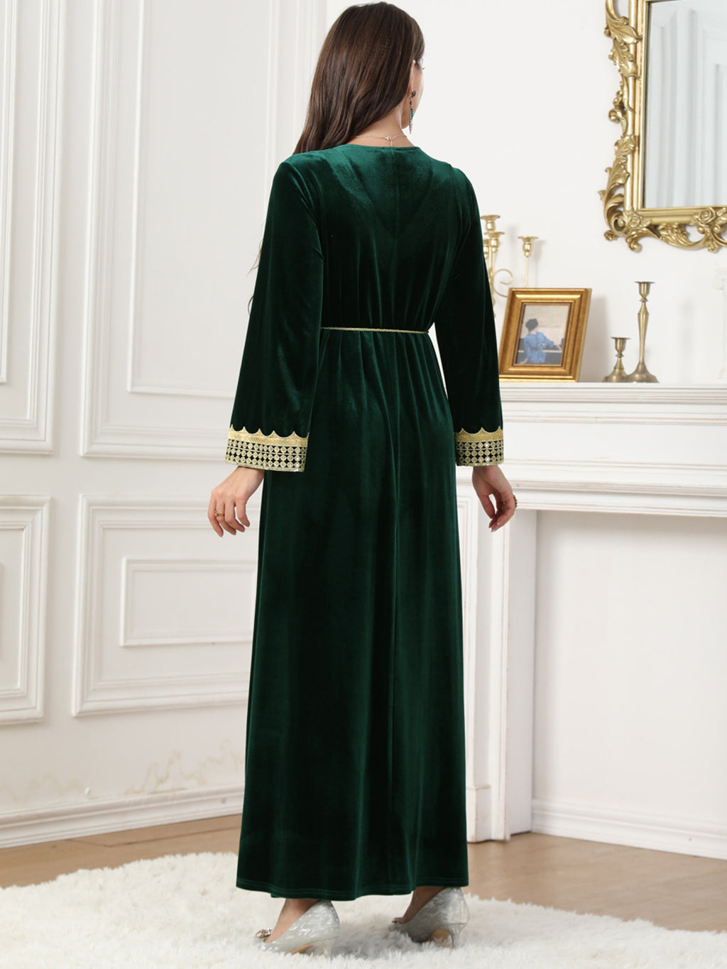 Ziet er prachtig uit bij elk evenement met de maxi -jurk met lange mouwen met de dames met kwastriem. Deze rijke blauwe jurk heeft gouden details langs het lijfje en de mouwen.