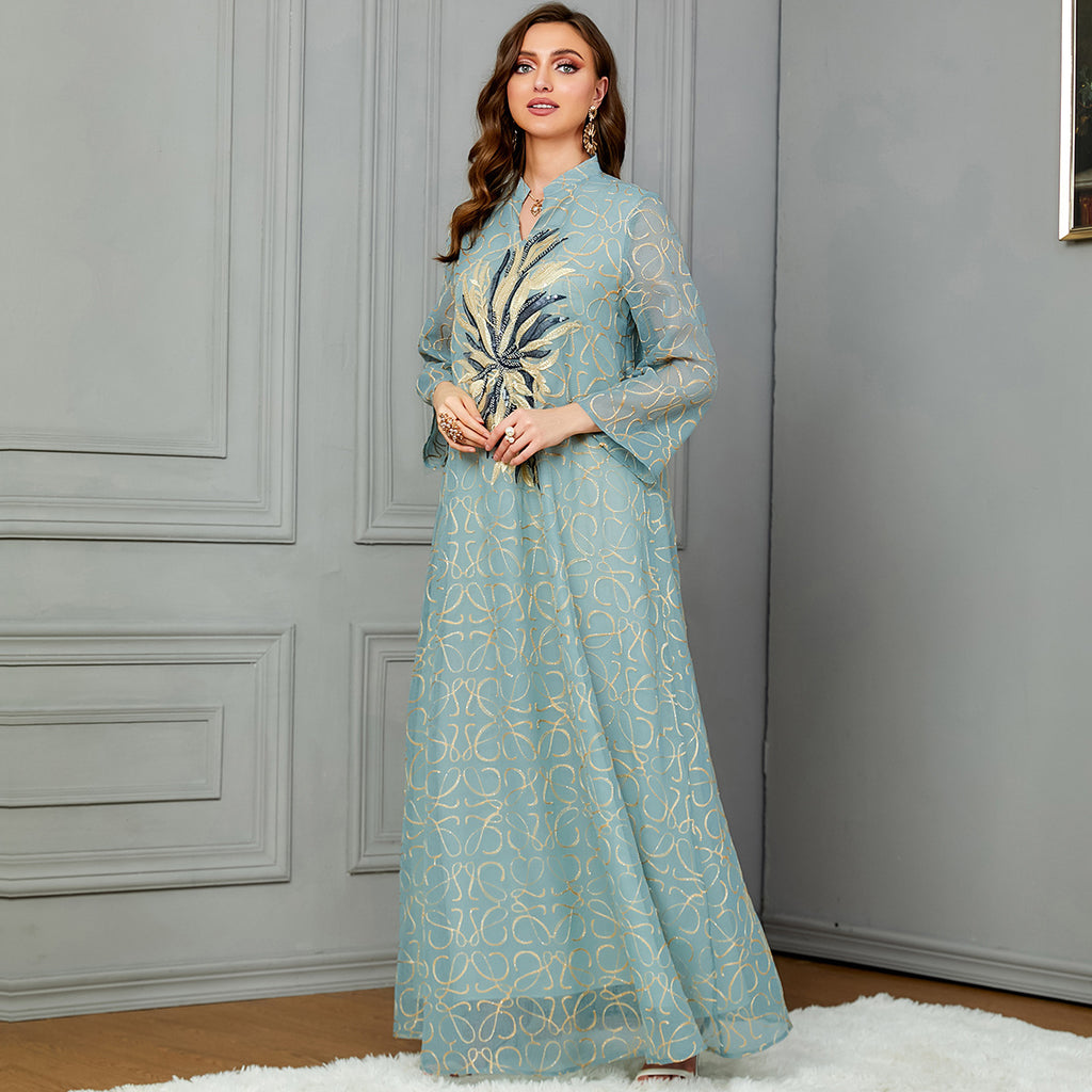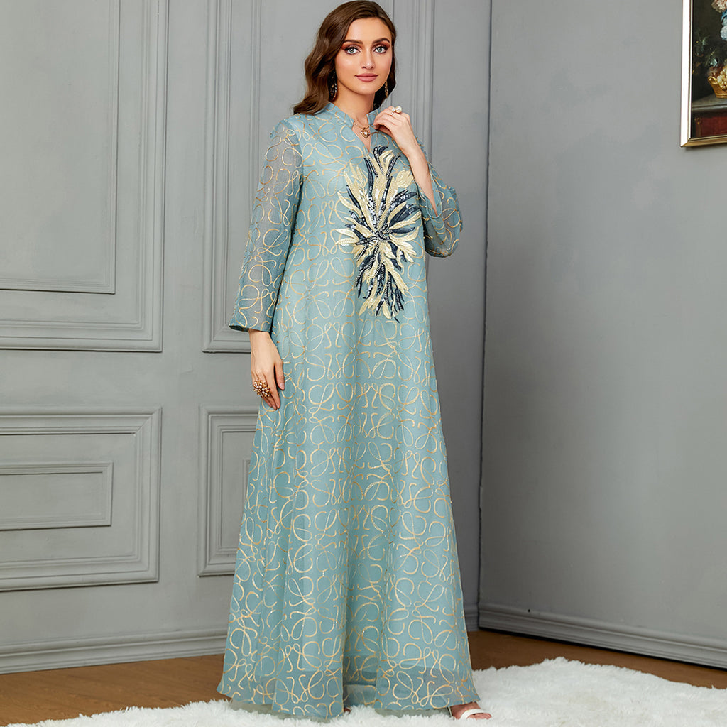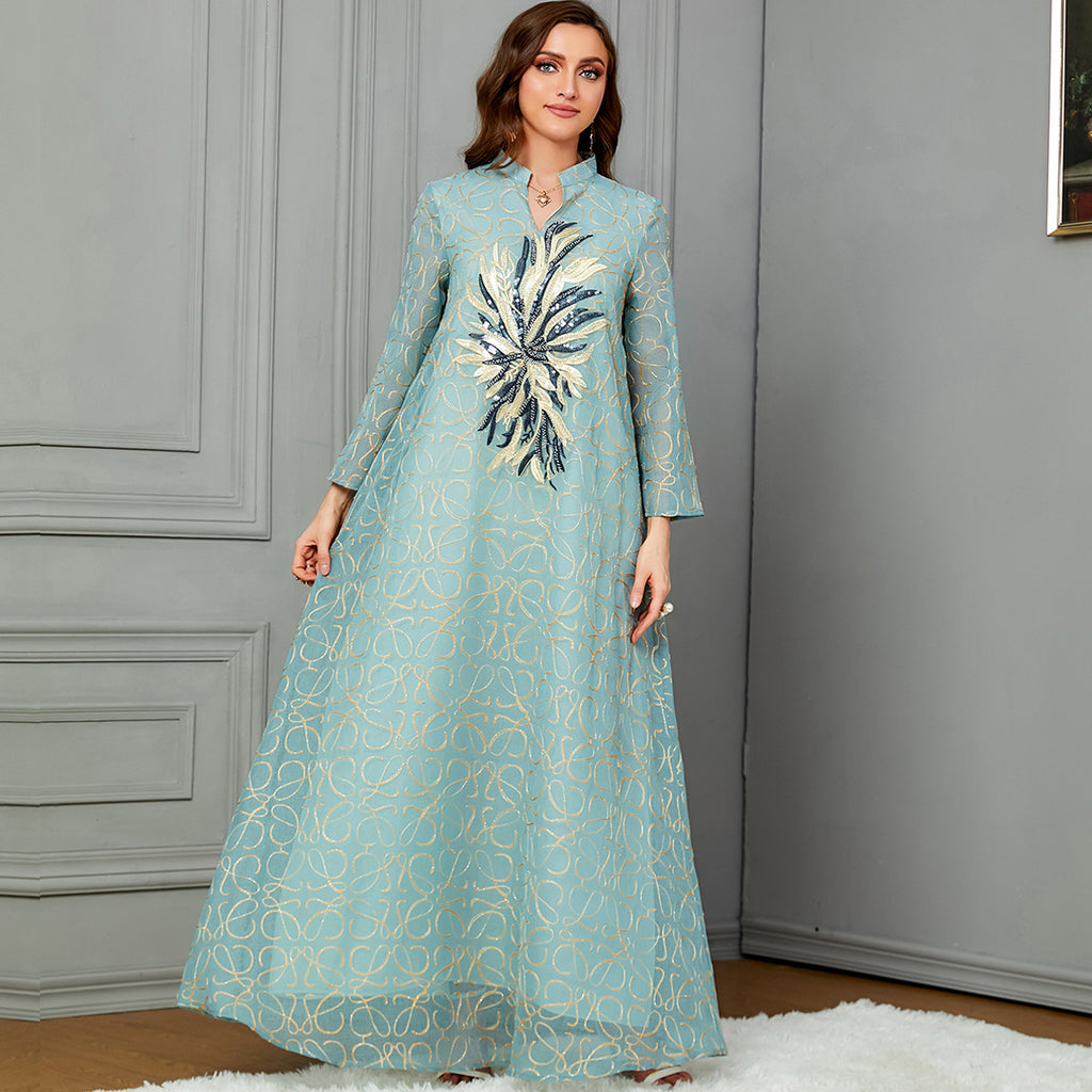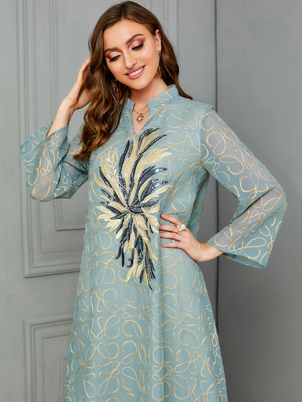 Sparkle in het licht met de semi-koele maxi-jurk met lange mouwen van de dames. Het beschikt over subtiele gouden wervelingen langs de lichtblauwe stof en een stijlvolle mockhals kraag.