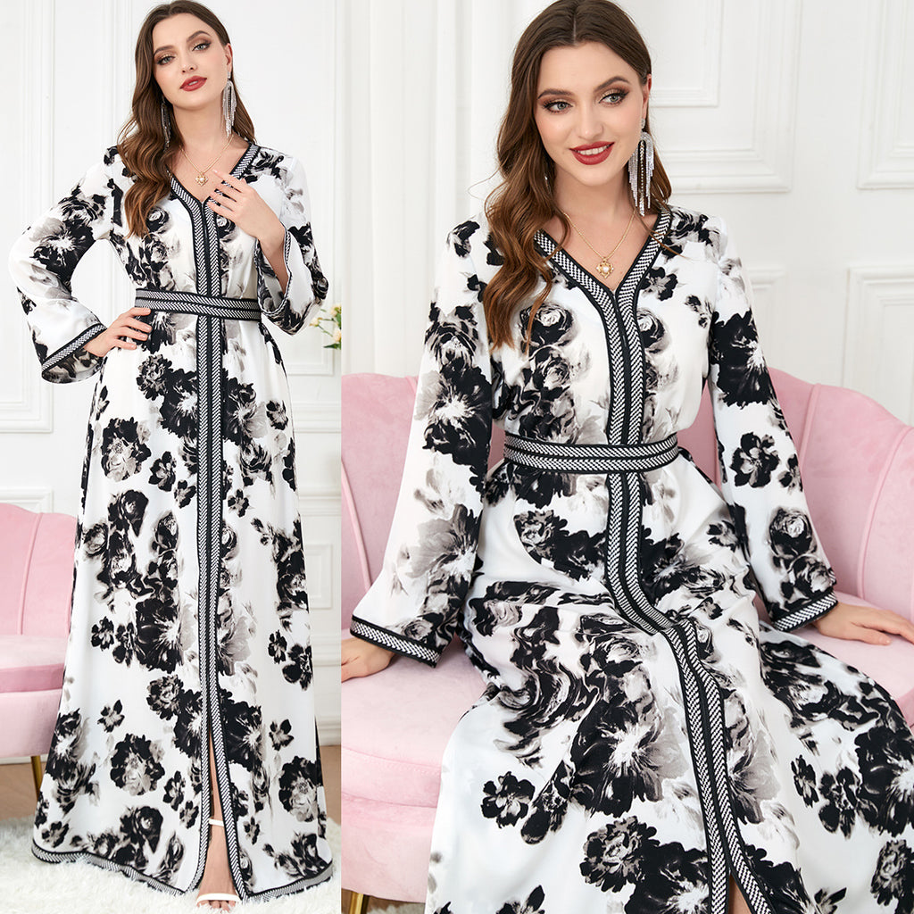 Houd het simpel en chic in de witte en zwarte bloemenmaxi -jurk met lange mouwen met de dames met zwart -wit geruite trim en een spleet aan de voorkant.