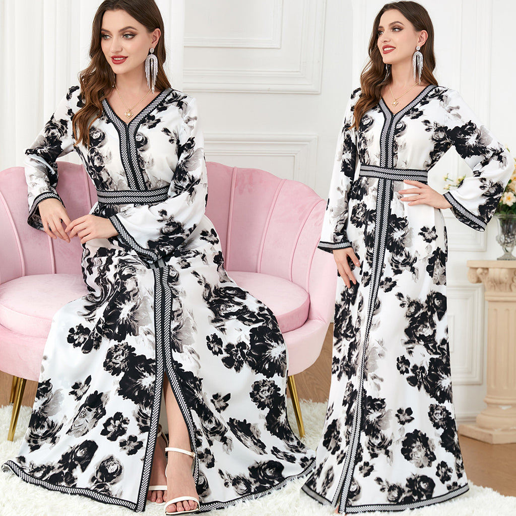 Witte en zwarte maxi -jurk met lange mouwen voor dames