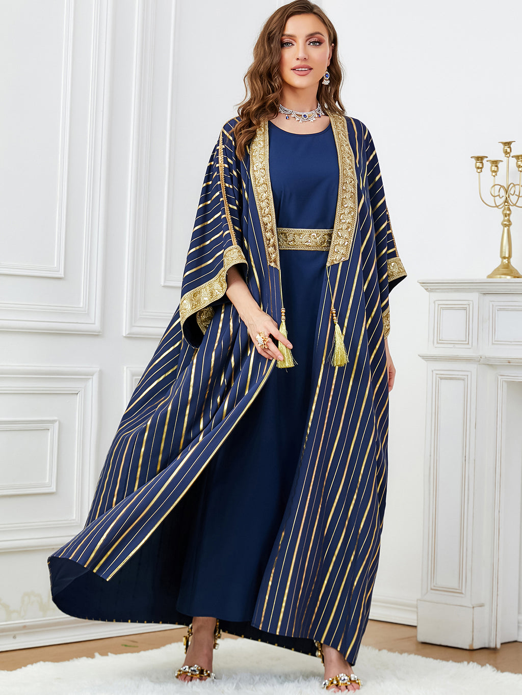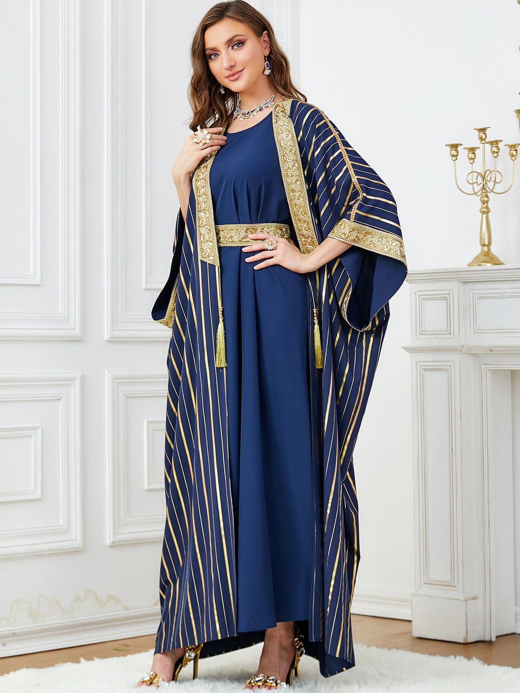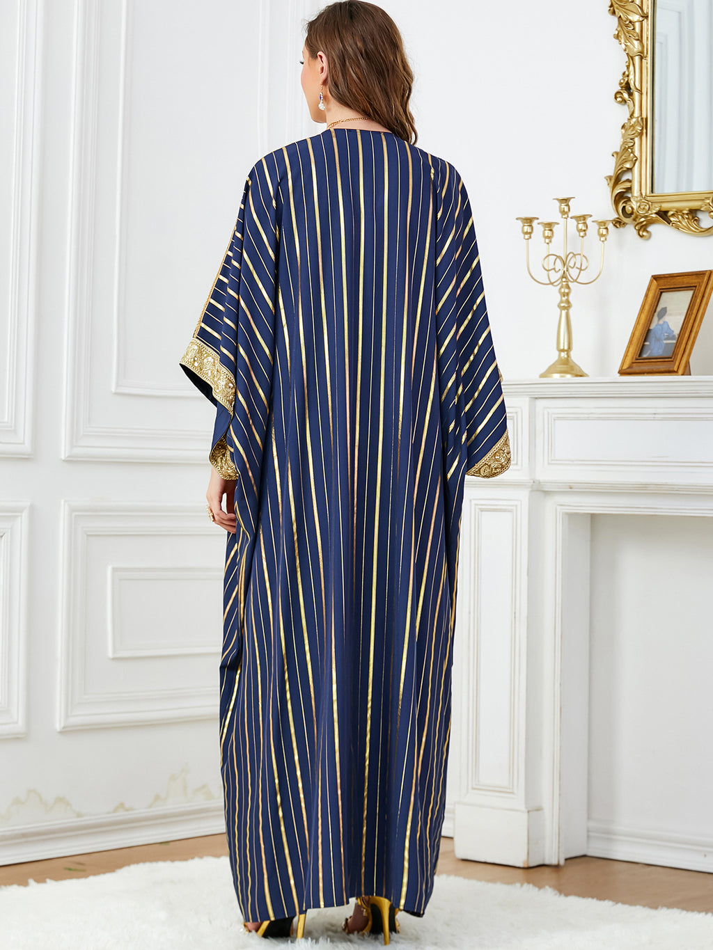 Als je de los passende poncho -mouw maxi -jurk van de dames draagt, voel je je comfortabel, cool en mooi. Het bestaat uit verticale blauwe en gouden strepen.