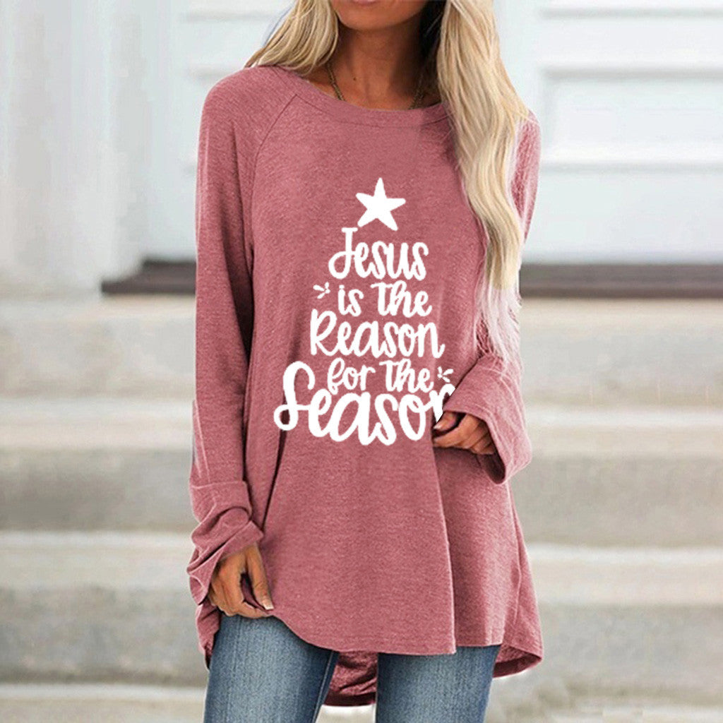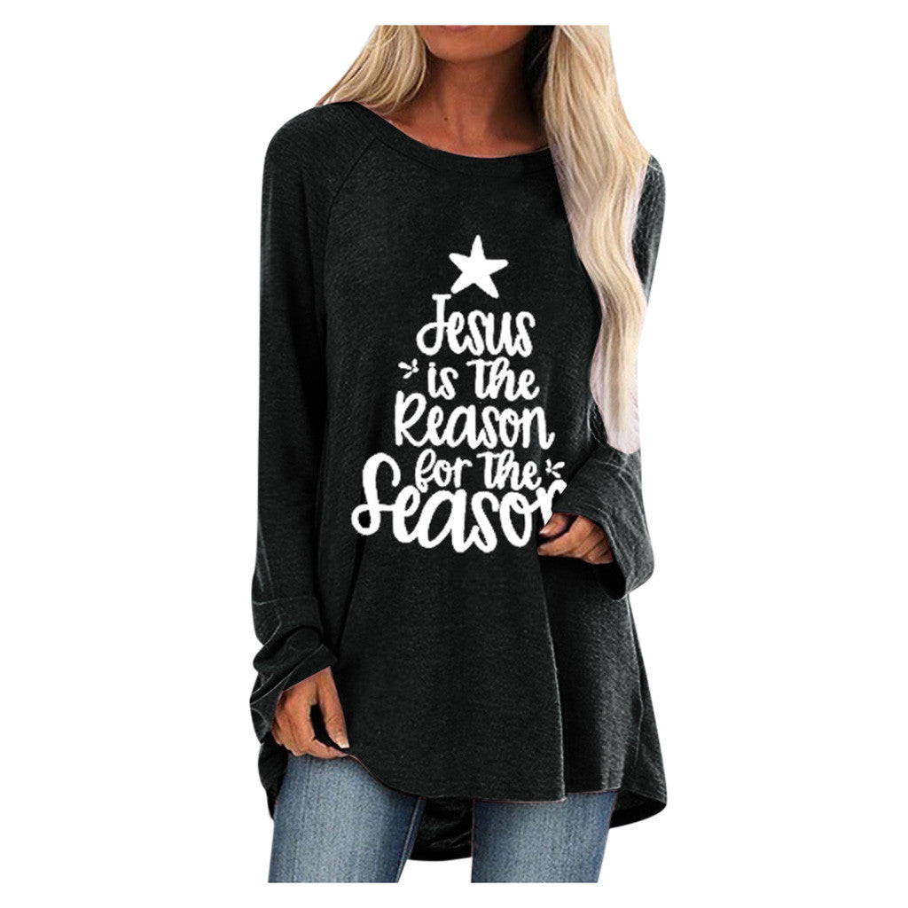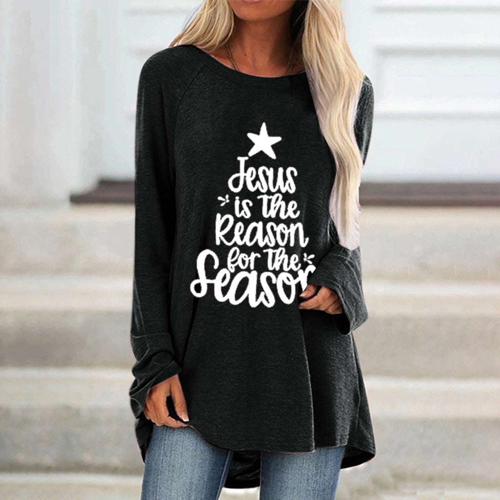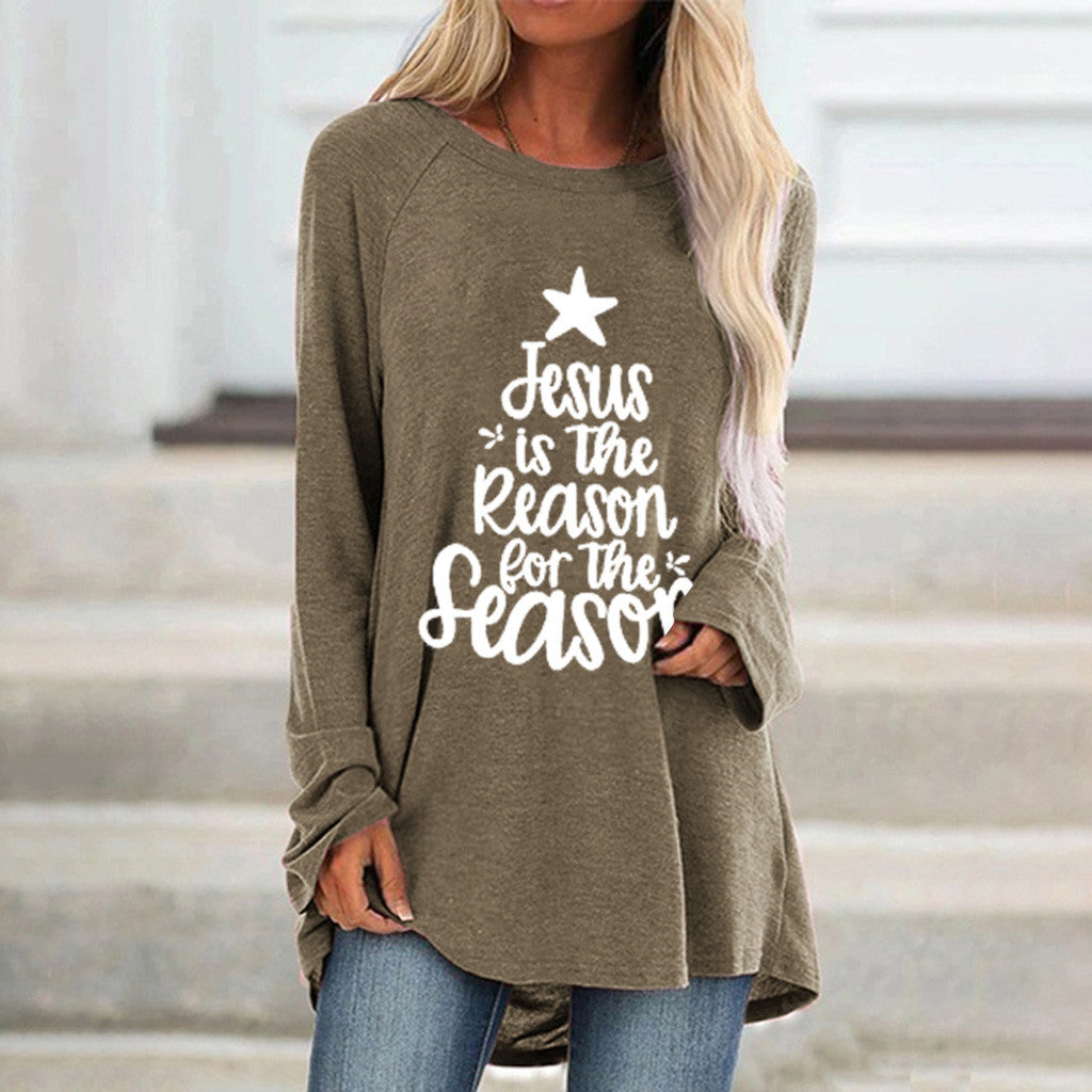 Remindothers to keep Christ in Christmas with this Jesus is the Reason for the SeasonWomen's top. A text based graphic in the shape of a Christmas tree sits in thecenter of the loose fitting shirt.