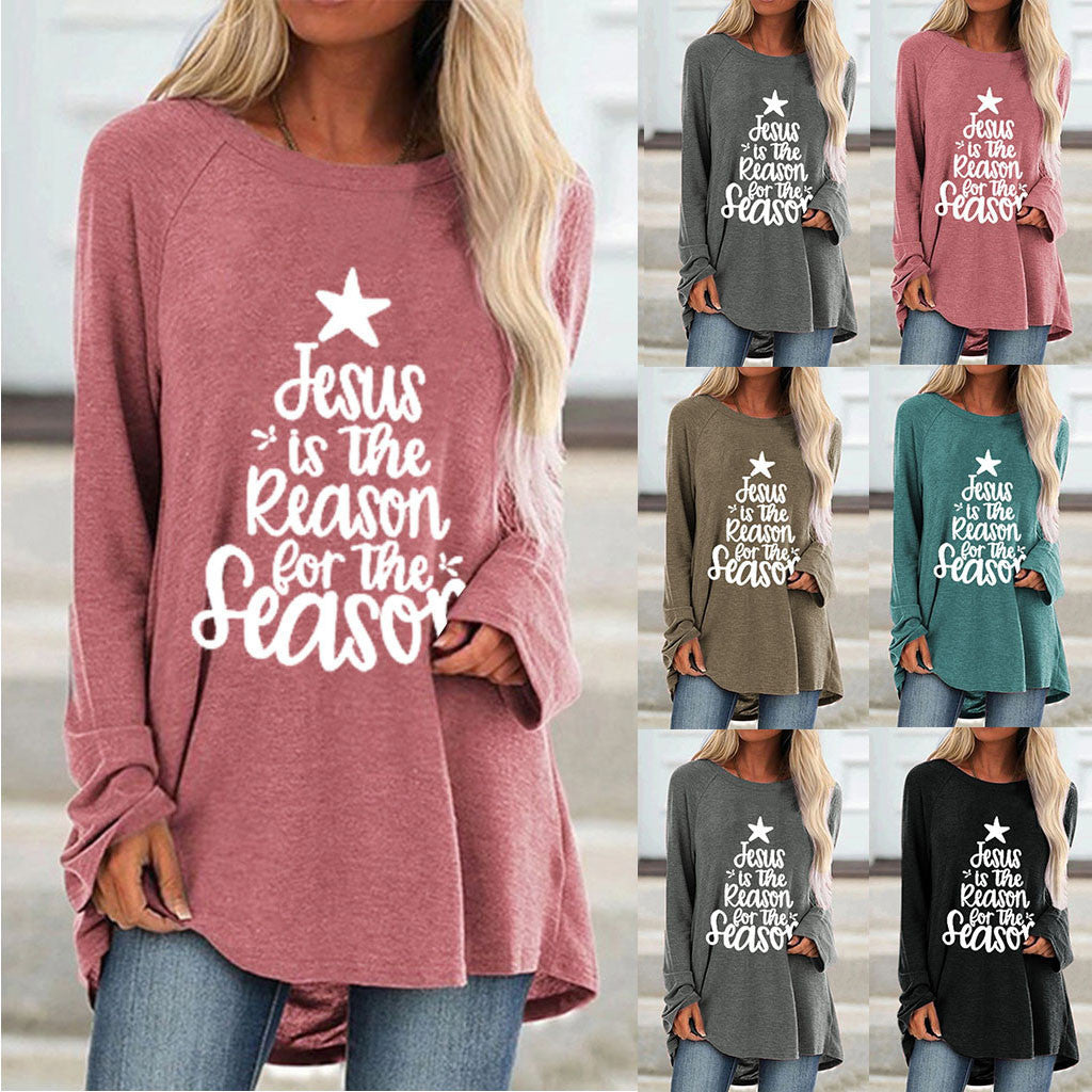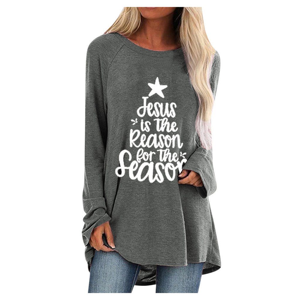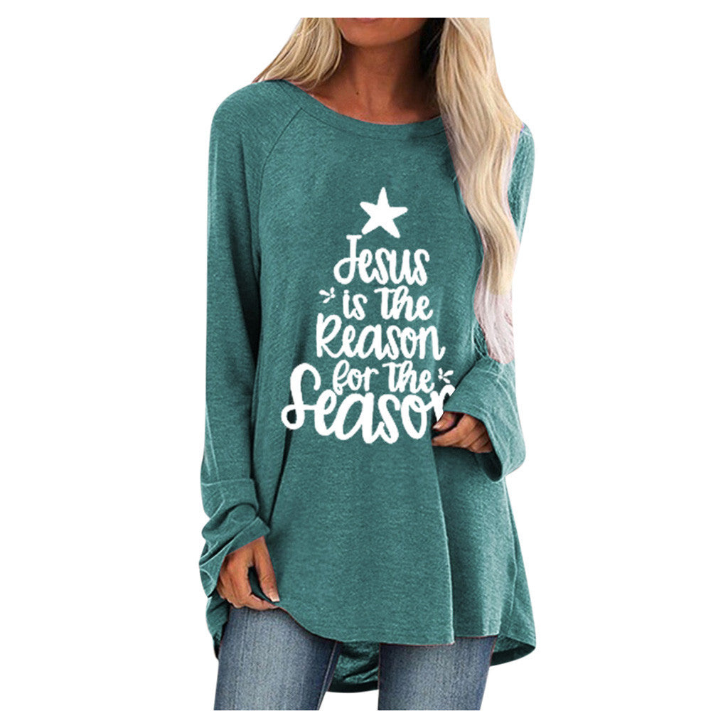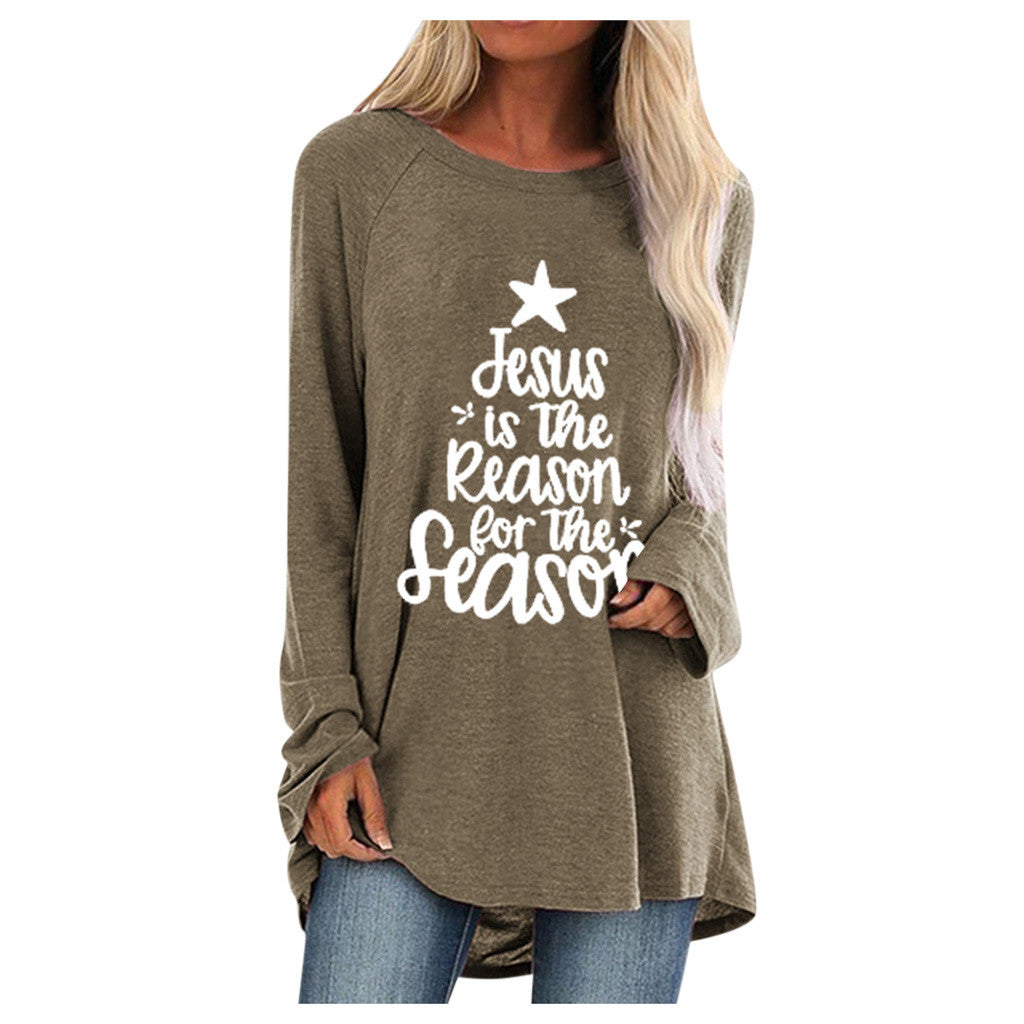 Remindothers to keep Christ in Christmas with this Jesus is the Reason for the SeasonWomen's top. A text based graphic in the shape of a Christmas tree sits in thecenter of the loose fitting shirt.