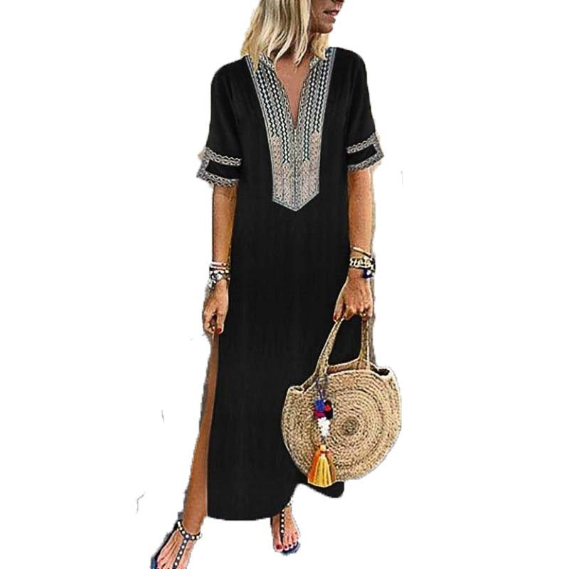 Get a classic look this summer wearing the Women's Short Sleeve V-Neck patterned Maxi Dress with Leg Slit. This loose-fitting dress features decorations around the neck and sleeves and comes in various color options.